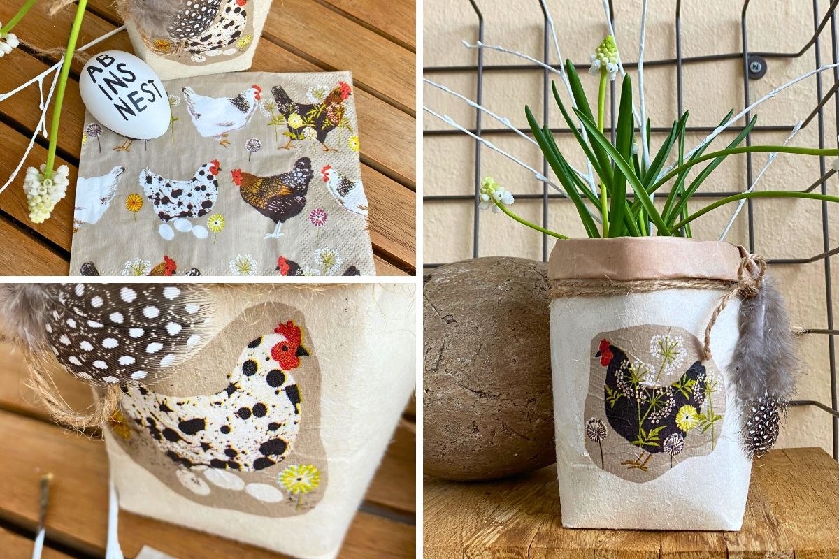 Wenn du magst, kannst du den schlichten Anzuchtbecher mit weißer Farbe betupfen. Bei mir bekam der Osterhase oder der Topf ein Schleifchen. Beides mit einer Schleife zu versehen, erschien mir zu überladen. Ein Ostergruß – geschrieben, gestempelt oder ausgedruckt – macht das Mitbringsel perfekt. Hübsche Perlhuhnfedern gefallen mir gut als Verzierung von Goodies für den Ostertisch.