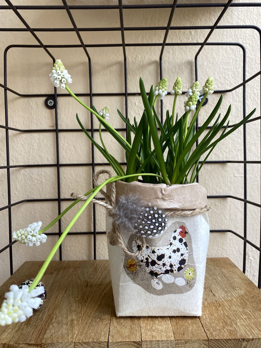 Nicht jede Pflanze passt in diesen selbst gemachten Blumentopf. Ideal sind Zwiebelblüher wie Traubenhyazinthen, Tulpen oder Hyazinthen. Ist der Wurzelballen zu groß, wird es schwierig ihn in die Tüte zu bekommen.