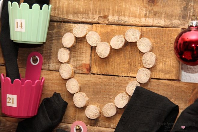 Da ich den Kalender nicht selbst gebastelt habe, kann ich Dir auch wenig Erklärung geben. Du benötigst Palettenholz, Buchstaben aus Pappmaschee, die Du in Deiner Wunschfarbe anmalen kannst, Ketten zum Aufhängen und diverse kleine Dekomaterialien mit Herz ♥.