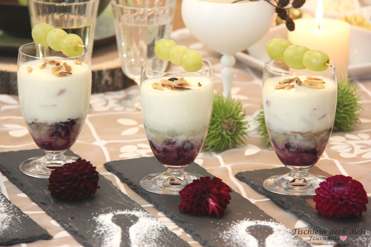 Zunächst musst Du die Blattgelatine in kaltem Wasser einweichen. Nun wird der Weißwein erhitzt, aber vorsichtig, er soll nicht kochen. Den Zucker unterrühren. Nun die Sahne steif schlagen. Die eingeweichte Gelatine gut ausdrücken und im warmen Wein auflösen. Bevor Du die geschlagene Sahne unterheben kannst, muss der Wein abkühlen. Eine Handvoll Trauben klein schneiden und entkernen. Mit etwas Zimt in wenig Wasser 5 Minuten andünsten. Am schönsten sieht es aus, wenn Du einzelne Portionen der Weißwein-Creme in hübsche Gläser füllst. Die gedünsteten Trauben schichtest du zuerst ins Glas, obenauf dann die Creme. Das Dessert kommt nun für einige Stunden in den Kühlschrank. Also rechtzeitig vorbereiten. Für die Verzierung darfst Du kreativ werden. Ich habe mich an diesem Abend für Traubenspieße und geröstete Mandelsplitter entschieden. Sehr dekorativ durften die Traubenspieße auf den Gläsern Platz nehmen.