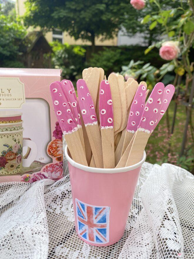 Zunächst wollte ich das Holzbesteck unverziert lassen, aber dann hat es mich doch in den Fingern gejuckt, wenigstens eine Gabel für jede anzumalen in pink mit weißen Tupfen.