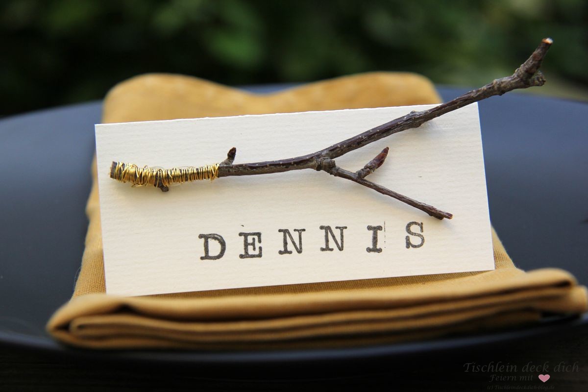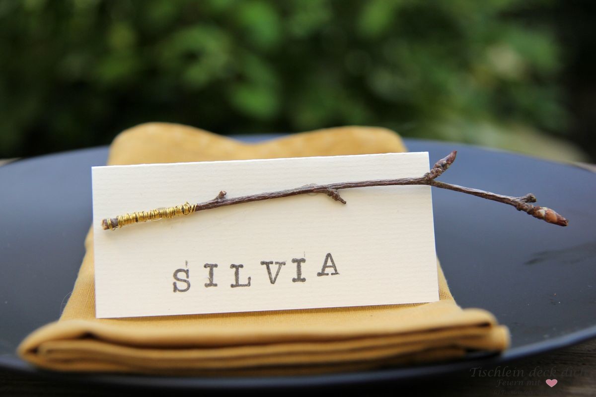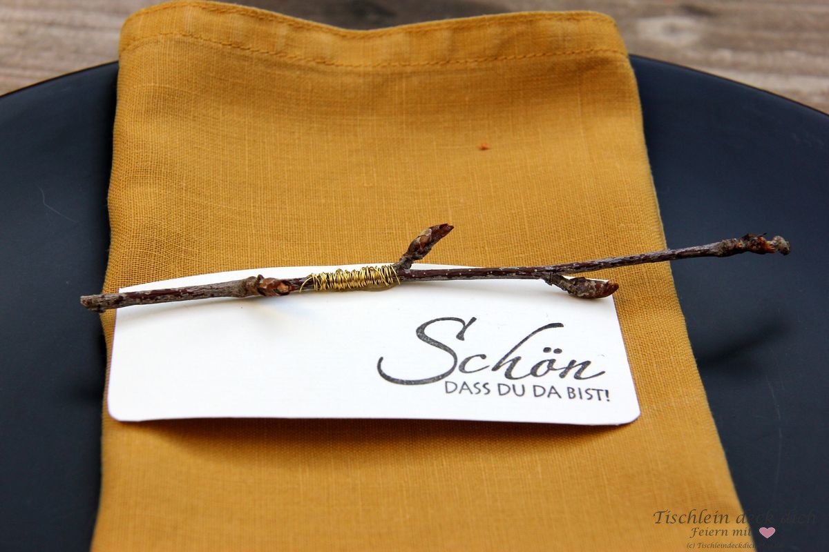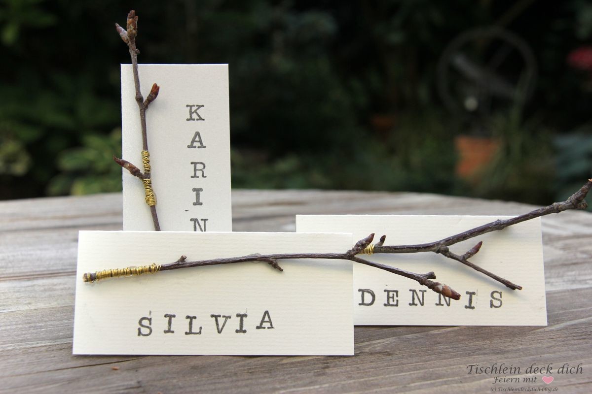 Von einem Spaziergang bringst Du Dir kleine, trockene Ästchen mit. An einer beliebigen Stelle umwickelst Du dieses mit etwas Golddraht. Eine Alternative dazu wäre Goldlack mit dem Pinselchen aufzutragen. Nun musst Du nur noch die Namen auf das Kärtchen stempeln. Versuche erst gar nicht, das absolut gerade und sauber hinzubekommen. Ich meine, das leicht schiefe und ungenaue macht den Charme des Stempelns aus. Mit 2-3 Tropfen Kleber oder der Klebepistole befestigst Du den Zweig auf der Tischkarte und schwupps – schon fertig.
