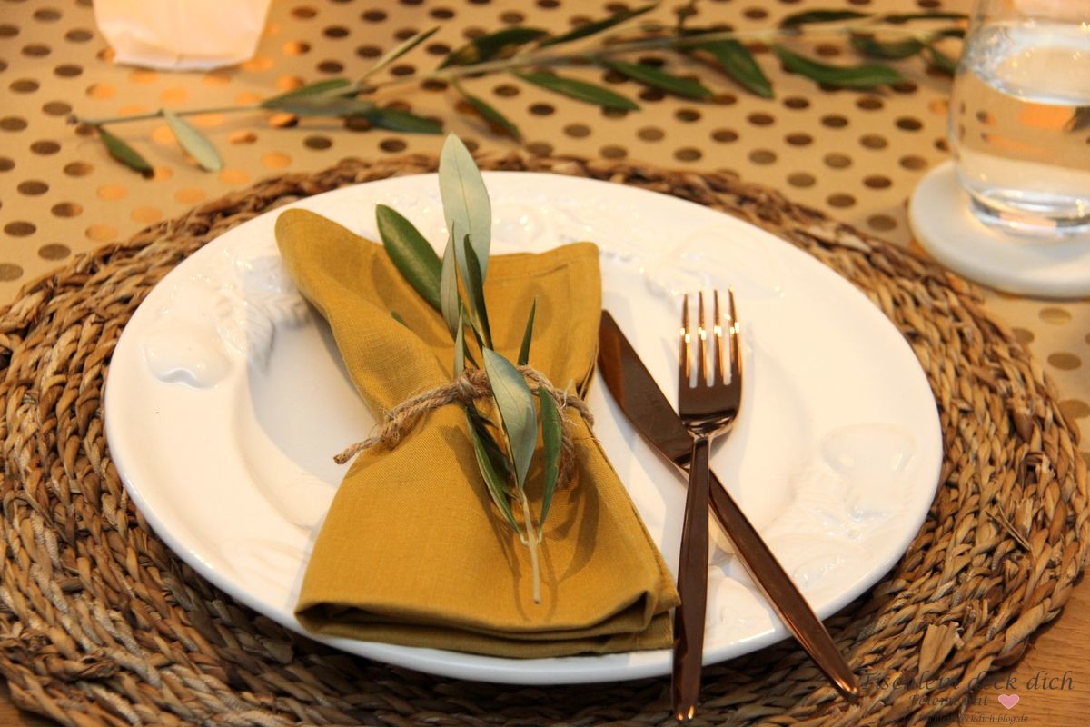 Für’s Essen zeichnet sich meistens Wolfgang verantwortlich und für die Tischdekoration natürlich immer ich. So habe ich mal in die Schränke geschaut, auf der Suche nach Ideen für eine kleine, aber feine Tischdekoration für unser Candle light Dinner. Was ich dort nicht gefunden habe, waren die Olivenzweige. Die hatte ich mir vom Wochenmarkt mitgebracht.