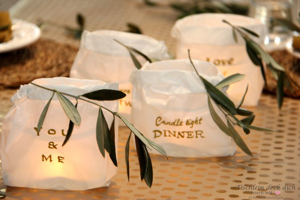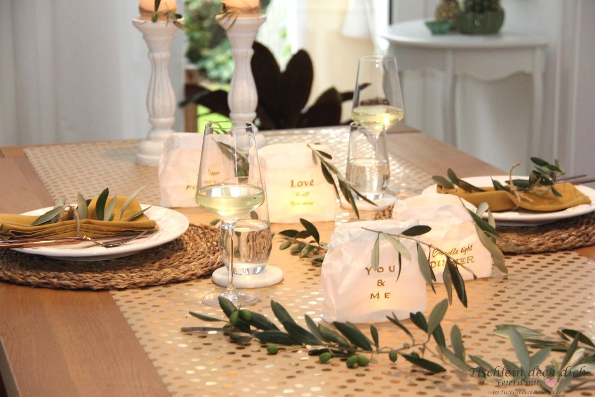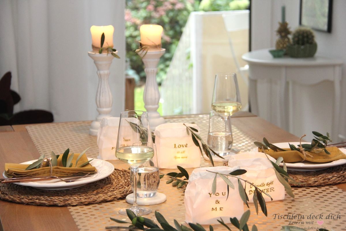 Viel Platz der ausgefüllt werden will. Geholfen haben noch die Olivenzweige die ich locker über den Tisch verteilt habe und zwei meiner weißen Holzkerzenleuchter. Die Servietten sind aufgepeppt mit einer Paketkordel und einem kleinen Olivenzweig. Platzkarten und Gastgeschenke erübrigen sich nun wirklich bei einer Tischdekoration für zwei ;-).