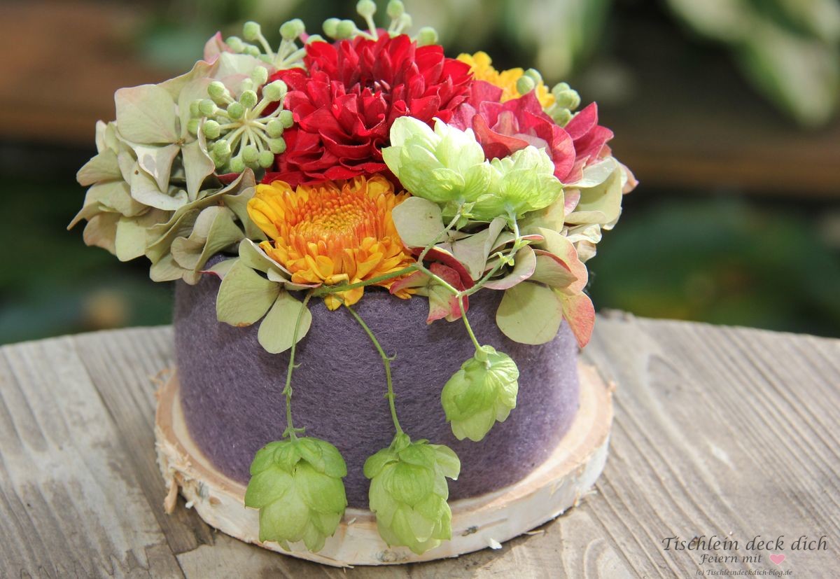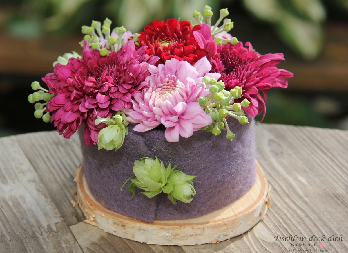 Nun das Filzband auf die passende Länge schneiden, um den Moosiblock legen und mit einer Stecknadel fixieren. Auch eine Krampe vom Floristen würde die Aufgabe übernehmen. Unter dem Filzband verschwindet nun auch die unschöne Plastiktüte. Alle Vorbereitungen erledigt! Jetzt ging es auf Streifzug durch unseren Garten für die Garnitur meiner Blumentörtchen. Meine Ausbeute: Hopfen, Efeublüten und Hortensien. Dahlien und Chrysanthemen habe ich vom Wochenmarkt.