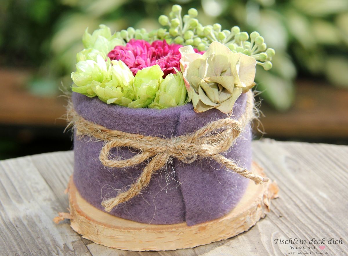 Schon wie bei meiner romantischen Blumendekoration vor 6 Wochen, kann man auch hier nichts falsch machen. So eng und kurz gesteckt werden wohl alle Blumen gut miteinander aussehen. Aber die Stilrichtung kann man durchaus ändern. Wenn es eleganter gewünscht wird, Rosen verwenden, zum Beispiel in Verbindung mit Nelken und Schleierkraut, gerne auch in rosefarben. Das Filzband kann ersetzt werden durch großflächige Blätter. Diese dann überlappend am Moosi festgestecken. Die Kordel nun noch durch Satinband ersetzen und Du wirst eine komplett andere Wirkung erzielen. Das Blumenarrangement dann auf eine kleine Porzellantortenplatte gestellt statt auf eine Holzscheibe – superschön.