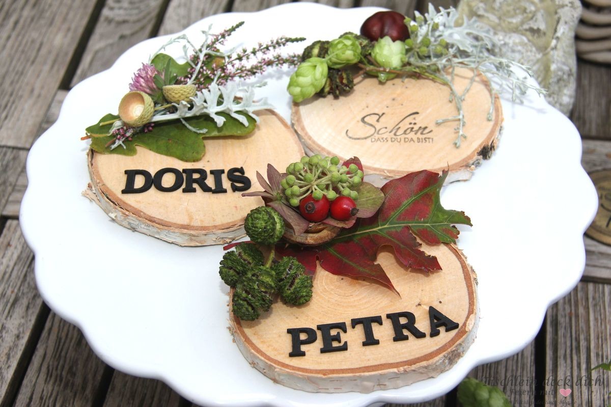 Eine weitere Möglichkeit wäre, den Namen des Gastes zu stempeln oder ‚Schön, dass Du da bist‘ . Oder auf Tonkarton den Namen schreiben und auf der Holzscheibe dekorieren.