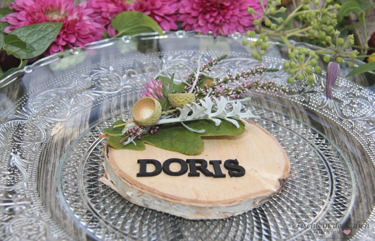 Wenn das Farbmotto feststeht, beginnst Du deine Fundstücke auf dem Blatt zu arrangieren und mit der Klebepistole zu fixieren. Tipp: Bei Erika, Stacheldrahtblume und Co.empfiehlt es sich, kleine Sträußchen zu binden und mit dünnem Silberdraht zusammen zu halten. Die Namen habe ich mit kleinen Holzbuchstaben locker auf der Holzscheibe arrangiert. Ein Scrabble Spiel findet sich in fast jedem Haushalt. Die Buchstaben eignen sich auch bestens für Tischkarten. Bei ‚Wolfgang‘ und ‚Hildegard‘ stößt man dabei allerdings platzmäßig an Grenzen ;-). Eher was für Mama, Oma, Opa…