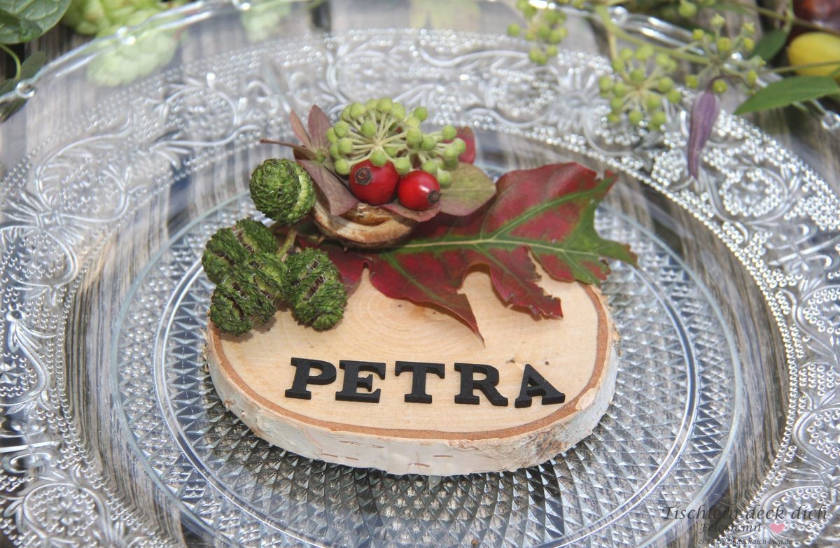 Wenn das Farbmotto feststeht, beginnst Du deine Fundstücke auf dem Blatt zu arrangieren und mit der Klebepistole zu fixieren. Tipp: Bei Erika, Stacheldrahtblume und Co.empfiehlt es sich, kleine Sträußchen zu binden und mit dünnem Silberdraht zusammen zu halten. Die Namen habe ich mit kleinen Holzbuchstaben locker auf der Holzscheibe arrangiert. Ein Scrabble Spiel findet sich in fast jedem Haushalt. Die Buchstaben eignen sich auch bestens für Tischkarten. Bei ‚Wolfgang‘ und ‚Hildegard‘ stößt man dabei allerdings platzmäßig an Grenzen ;-). Eher was für Mama, Oma, Opa…