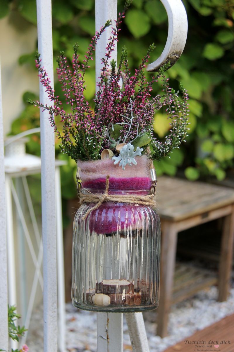 Dieses Glas dümpelte so im Garten vor sich hin. Zuerst musste ich es erst mal vom angesetzten Grünspan befreien. Eingefüllt habe ich dann nur ein paar kleine Holzscheiben und Eicheln. Dadurch, dass ich statt rotem Filzband lila/rosafarbenes genommen habe, ändert sich der Look. Unserem schrabbeligem Handlauf der Treppe zum Garten steht die Deko richtig gut.