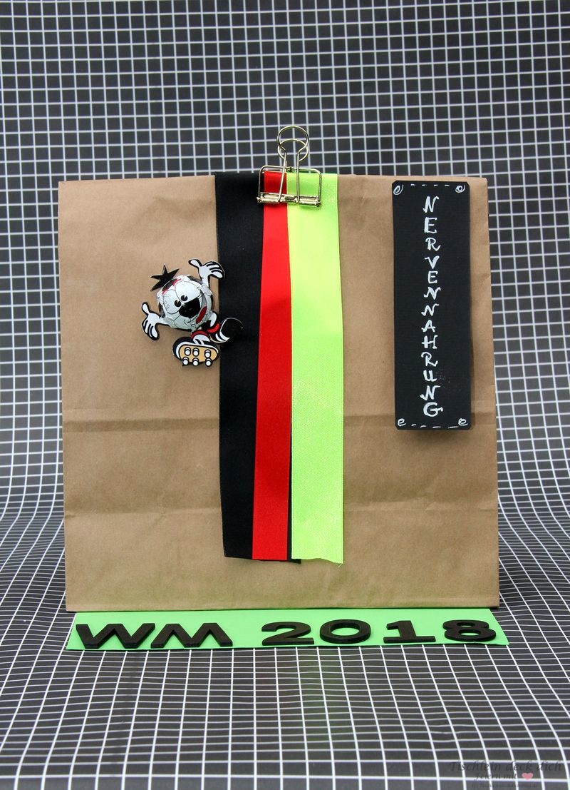 Der schwarz-weiß karierte Hintergrund ist Geschenkpapier von der Rolle. Eigentlich hatte ich dies nur für mein Foto besorgt, weil es mich an das Netz eines Fußballtors erinnerte. Am Abend des ersten Spiels unserer Nationalelf habe ich das Papier dann noch als Tischläufer benutzt. Mit einer Länge von 2 m und einer Breite von 0,70 m eignet sich das ideal. Ich habe mir das Papier für unseren Tisch passend zurecht geschnitten. Der „Tischläufer“ war die perfekte Unterlage für meine Schnittchen, die Kaltgetränke und die WM-Tüten.