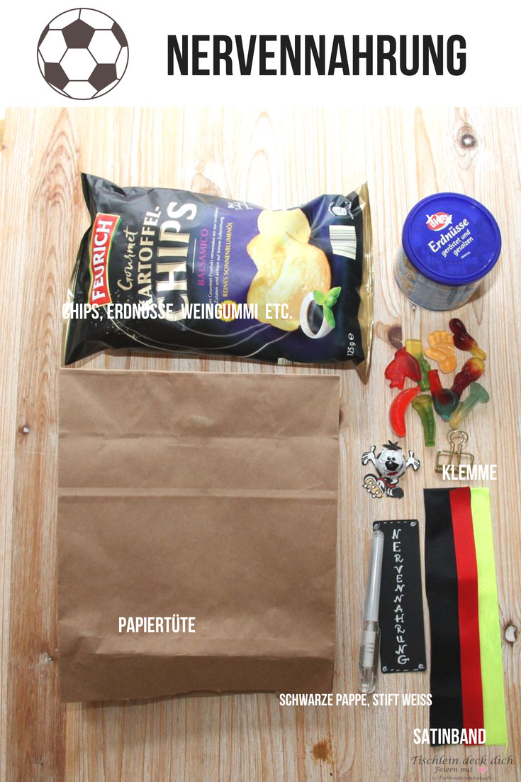 Nun musst Du die Tüten für die WM Deko nur noch mit „Nervennahrung“ füllen, mit der Klemme verschließen und entsprechend dekorieren. Vielleicht kennst Du die unterschiedlichen Geschmäcker Deiner Fußballfans? Dann ist es natürlich schön, wenn Du das berücksichtigst. Die Tüte benötigt in diesem Fall auch ein Namensschildchen. Nicht vergessen! Ansonsten machst Du eine bunte Mischung. Chipstüten, Gummibärchen, Schokolade…das alles gibt es auch im Kleinformat. Vielleicht packst Du noch ein Päckchen Papiertaschentücher mit lustigem Aufdruck zum Tränen trocknen in die Tüte. Freudentränen – ist klar, oder?
