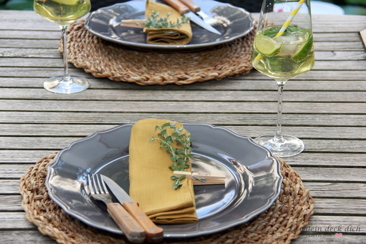 Wolfgangs berühmten und superleckeren Burger vom Grill haben aber ein wenig Tischdeko mehr als verdient und so kam meine schnelle Serviettendeko wieder zum Einsatz. Holzklammern habe ich ausreichend, Rosmarin jedoch nicht. So habe ich dann improvisiert und ein Gewächs aus unseren Blumenkästen abgeschnitten.