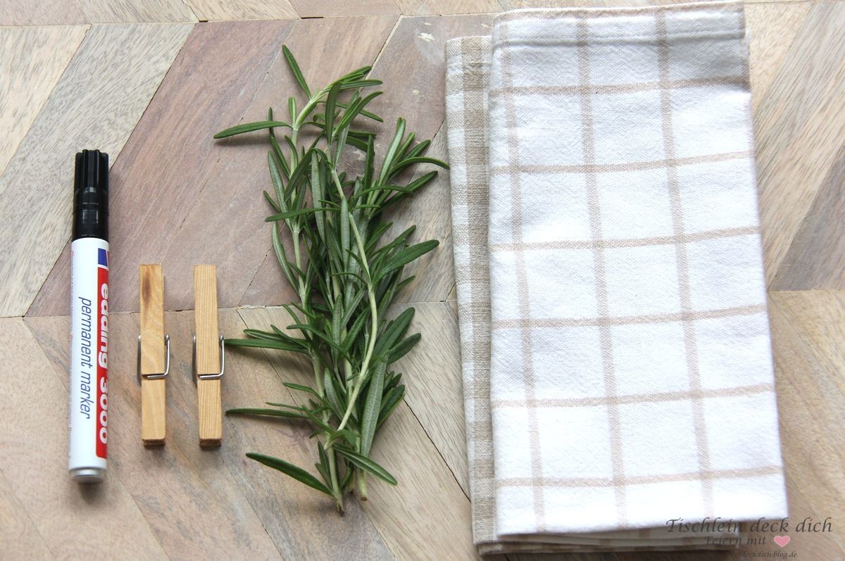 Alles was Du dafür benötigst ist ein schwarzer Edding, eine Holzwäscheklammer, einen Rosmarinzweig und natürlich eine Serviette. Ja gut, viel Erklärung bedarf es wohl nicht, oder? Ich finde das klasse, wie man so, schnell einen kleinen mediterranen Touch zaubern kann. Das passende Geschirr tut natürlich sein übriges. Leinen- oder Baumwollservietten eignen sich am besten.