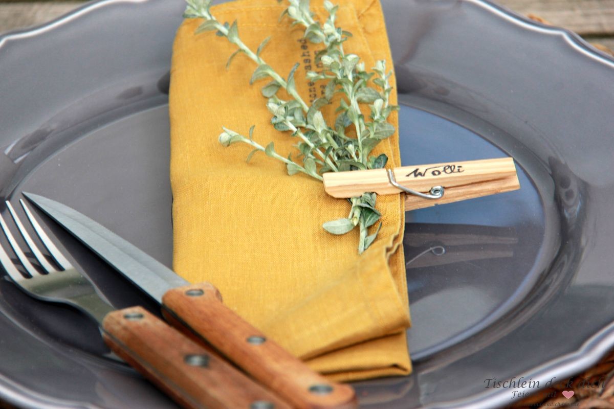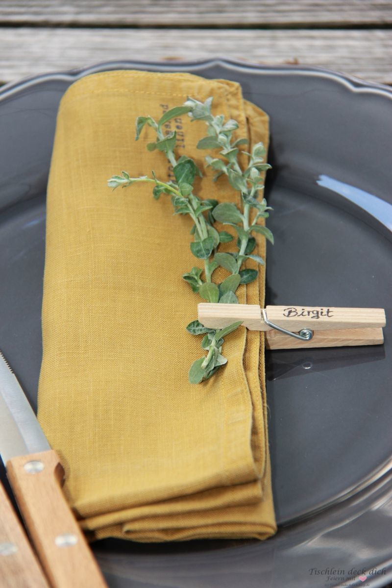 Alles was Du dafür benötigst ist ein schwarzer Edding, eine Holzwäscheklammer, einen Rosmarinzweig und natürlich eine Serviette. Ja gut, viel Erklärung bedarf es wohl nicht, oder? Ich finde das klasse, wie man so, schnell einen kleinen mediterranen Touch zaubern kann. Das passende Geschirr tut natürlich sein übriges. Leinen- oder Baumwollservietten eignen sich am besten.