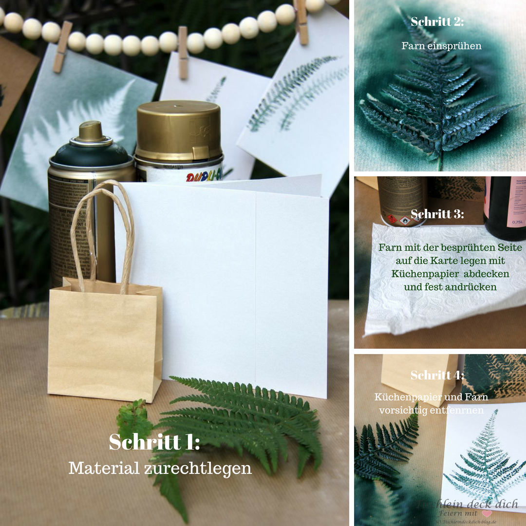 Zutaten benötigst Du nur sehr wenige für die Kartengestaltung mit Farn, nämlich lediglich Blanko-Klappkarten in Weiß- oder Naturtönen, Sprühlack in dunkelgrün und evt. gold und natürlich Farn, alte Zeitung zum Abdecken des Tisches und Küchenpapier.