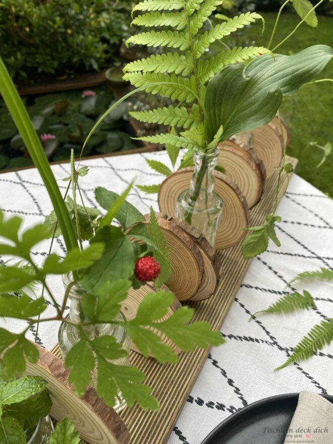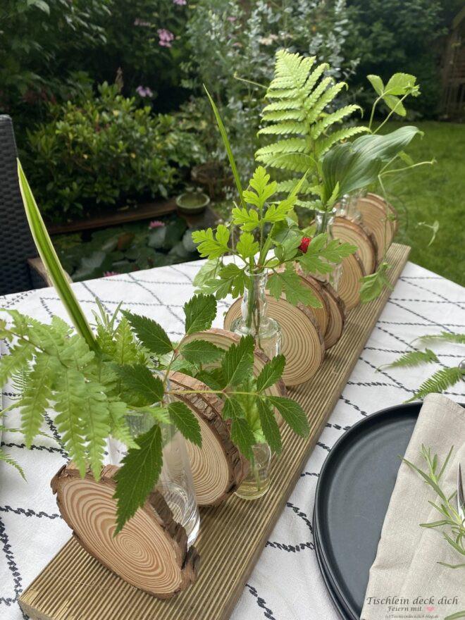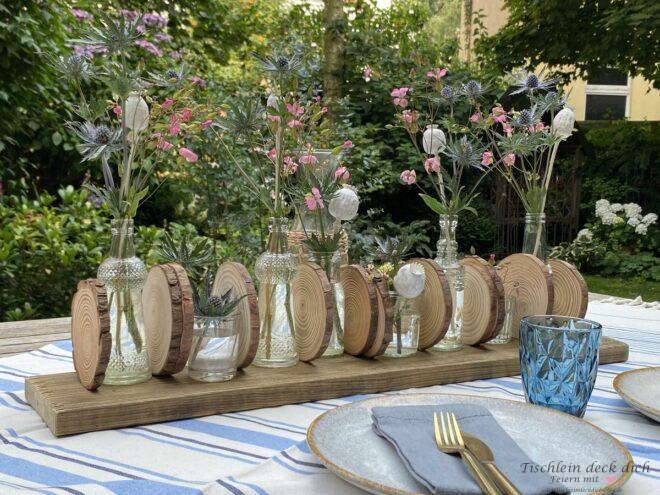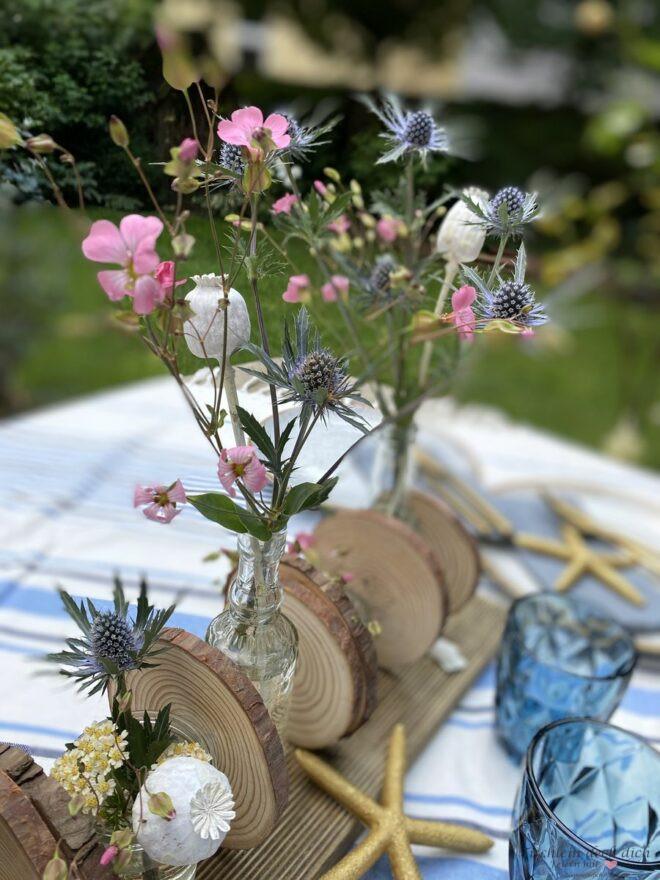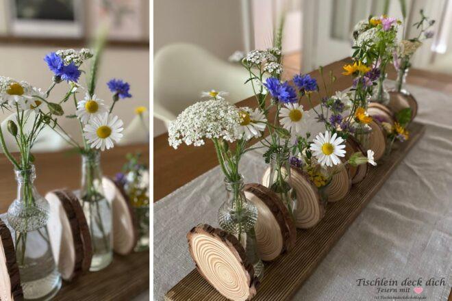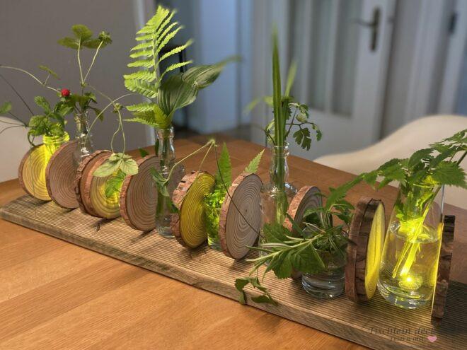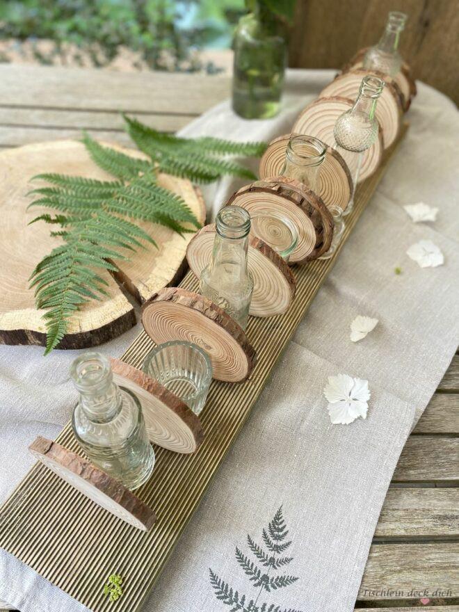 Wie gefällt Dir meine Idee mit den Baumscheiben und den kleinen Vasen? Sie ist einfach umzusetzen, auch wenn man handwerklich nicht zu begabt ist oder einfach nicht die Mittel hat, um komplizierte Sachen zu werkeln.