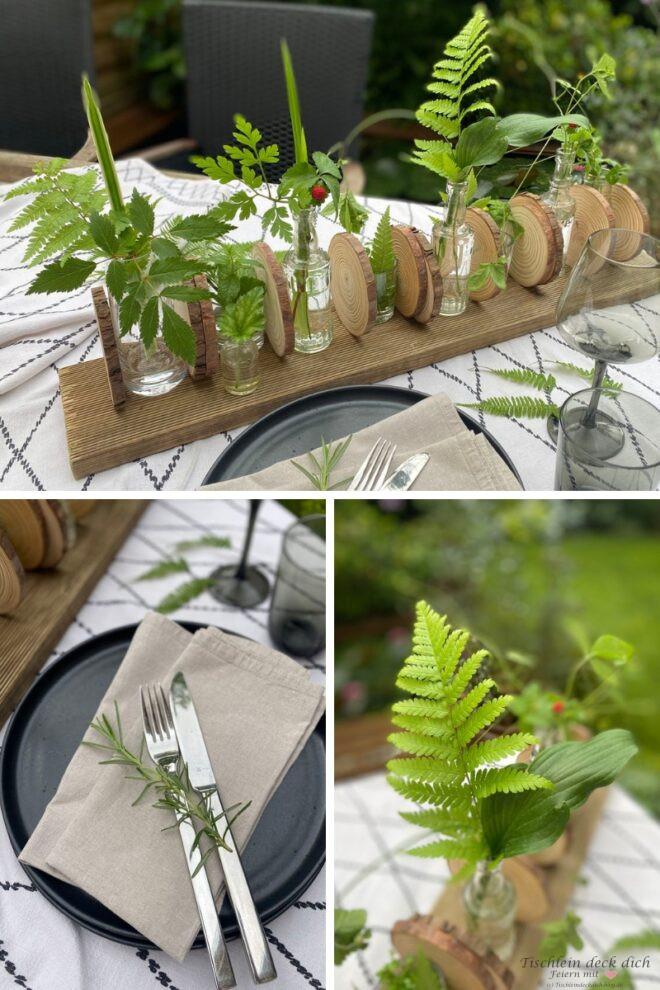 Diesen urbanen Look mit schwarzen Elementen und grünen Pflanzen mag ich sehr. Schon häufiger habe ich so dekoriert. Gut dazu passen Leinenstoffe in Form von Servietten und Tischdecke. Schau auch hier: Tischdeko im Urbanstyle