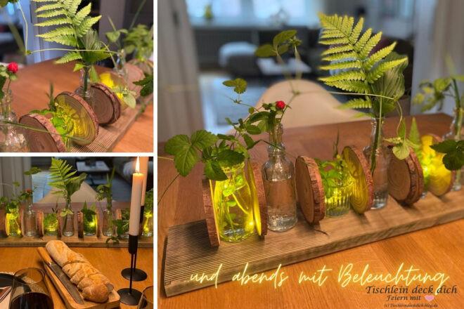 Neulich hatte Wolfgang sehr lecker für uns gekocht. Zu diesen Anlässen gehört immer eine kleine Tischdekoration dazu und meine Deko Idee mit Baumscheiben kam direkt mal zum Einsatz.