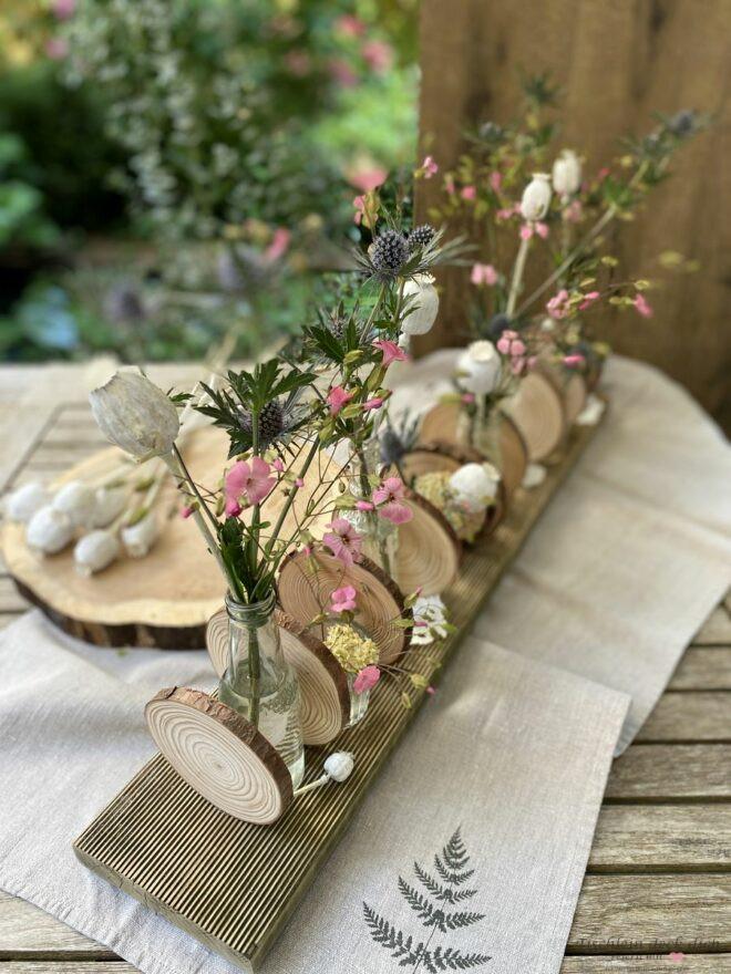 Deko Idee mit Baumscheiben – Bühne frei für tolle Blumenarrangements