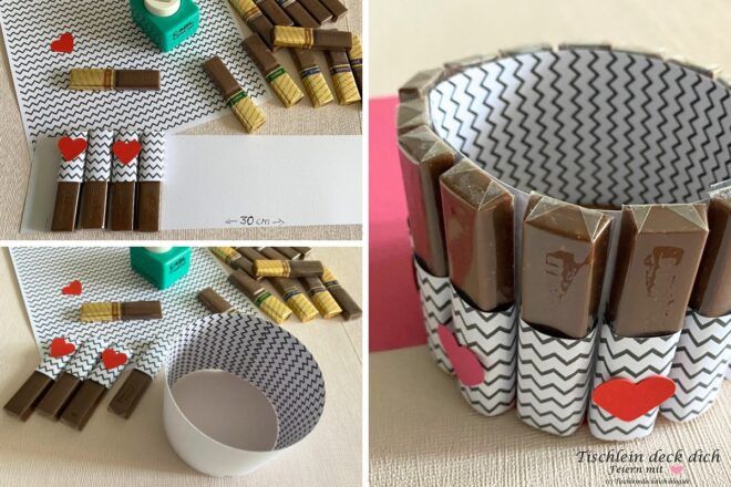 Mir gefällt der optische Bruch von dem schwarz-weißen Papier zu dem romantischen rosa und rot der Herzen und Blumen sehr gut. Ich finde, es macht es weniger kitschig, aber das ist wie immer reine Geschmacksache. Du kannst die Torte mit deinen favorisierten Farben gestalten und dekorieren. Alles ist möglich. Für die Banderolen solltest du unbedingt Druckerpapier oder ähnliches Papier in dieser Stärke verwenden. Dickeres Papier oder sogar Tonkarton lässt sich schlecht um die Schokoriegel wickeln. Tipp: Da mir das Muster meines Tonkartons gefiel, habe ich es auf dünneres Papier kopiert. Das gleiche funktioniert ebenfalls mit hübschen Serviettenmotiven, falls du da was hast, was dir gefallen würde.