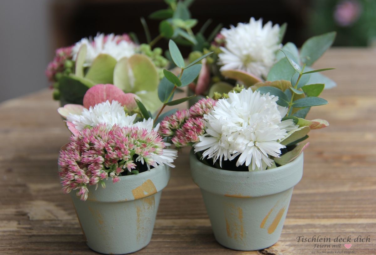 Auf den ersten Blick sehen meine Gastgeschenke gar nicht wie ebensolche aus. Die kleinen Mini-Tontöpfe hatte ich zunächst als Tischdekoration verwendet. Am Ende der Geburtstagsfeier durfte jeder Gast ein Mini-Blumengesteck mit nach Hause nehmen. Also: Gastgeschenk. Bei unserer klitzekleinen Feier im Familienkreis konnte ich das gut so machen. In größerer Runde stellst Du die Blumentöpfchen jedem Gast an seinen Platz.