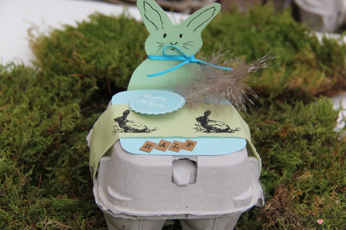 Die gleiche Idee habe ich zuvor schon mal umgesetzt. Statt Süßigkeiten bekommt mein Gast hier ein richtiges Osterei. Den kleinen Osterhasen schneidest Du nach Schablone aus. Als kleines Gimmick noch ein Stummelschwänzchen und Perlhuhnfeder. Meine Tischdekoidee gibt es hier.