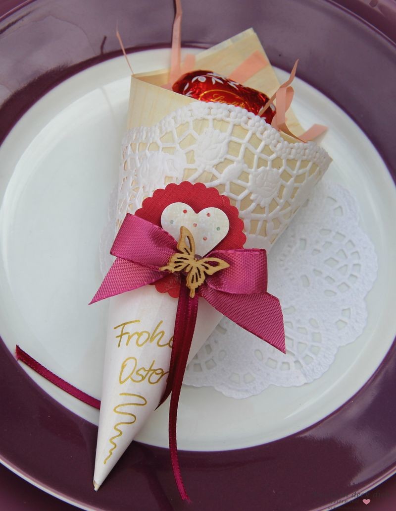 Für dieses liebevolle Gastgeschenk benötigst Du eine dünne Tüte aus Holz, alternativ kannst Du sie aber auch aus stabilen Tonkarton selber rollen. Danach musst Du eine Tortenspitze in vier Teile schneiden. Ein Teilstück wird dann um die Tüte gelegt und fixiert. Am Besten geht dies mit doppelseitigem Klebeband. Für die Verzierung nimmst Du, was so da ist. Schleifenband, frühlingshafte Streuartikel. Für das „Ostergras“ habe ich Seidenpapier in ganz dünne Streifen geschnitten und dann als Füllung in die Tüte gesteckt. Nun brauchst Du nur noch leckere Schokoeier und fertig.