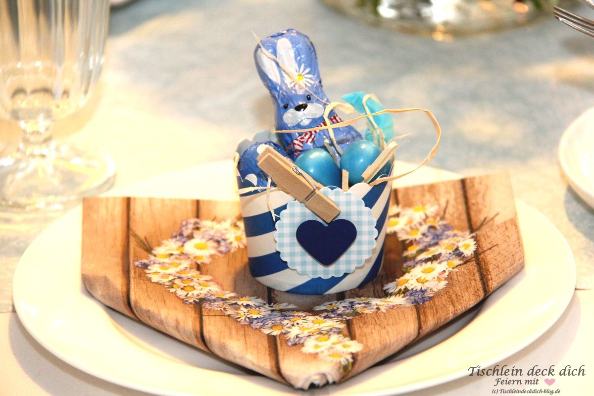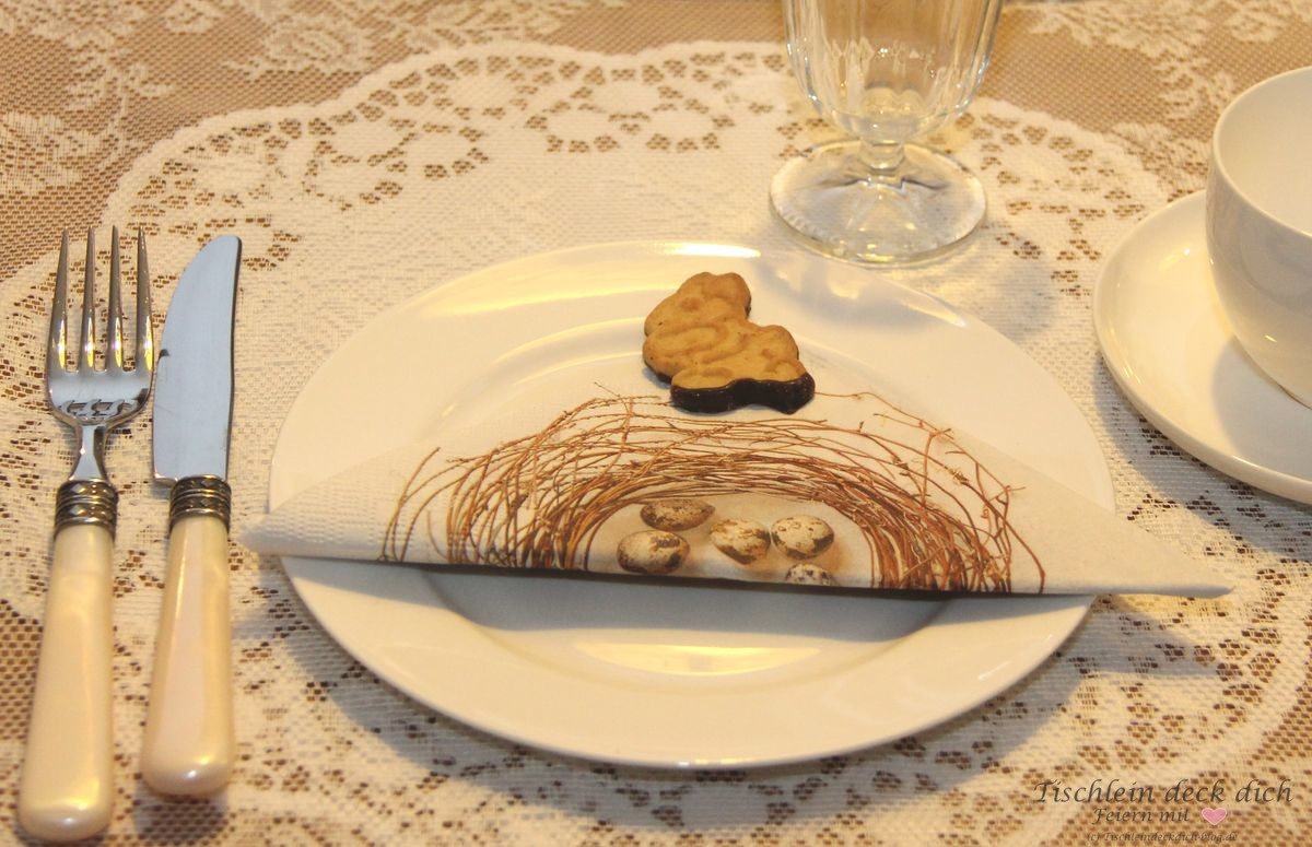 Wenn Du mal gar keine Lust zu basteln hast oder Dir schlichtweg die Zeit fehlt, dann besorge Dir eine nette Nascherei. Hier, bei meiner Vintage-Ostertischdekoration, war es ein kleiner Mürbeteighase. Aber auch eine leckere Praline oder ein leckerer Trüffel wäre eine nette Geste für die Gäste. Gastgeschenk zum Sofortvernaschen, warum nicht? 😉