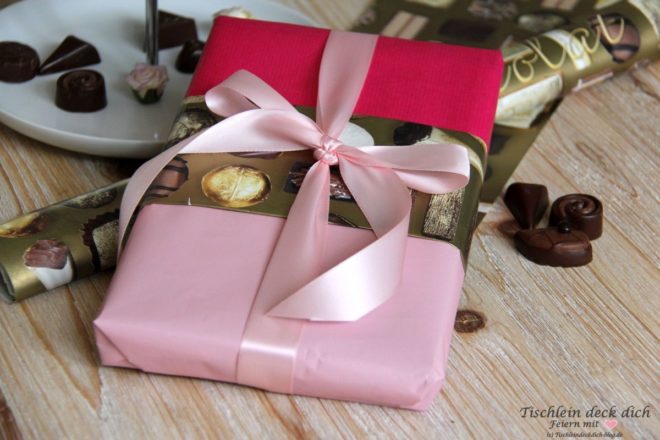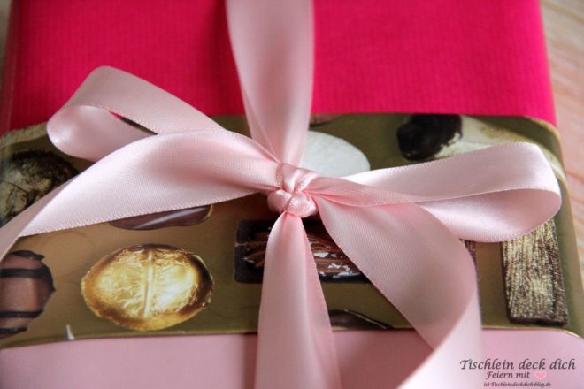 Zu guter Letzt benötigte das Geldgeschenk zur Hochzeit noch eine schöne Verpackung. Normalerweise hätte ich das Geschenkpapier mit Pralinenmotiv nicht gekauft. Es ist eher… nicht so schön. Ich hatte es im Papiertiger-Kellerarchiv gefunden. Für meine Zwecke fand ich es ideal. Ich kombinierte das merkwürdige Pralinen-Geschenkpapier mit rosa- und pinkfarbenen Papier und dicker Satinschleife.