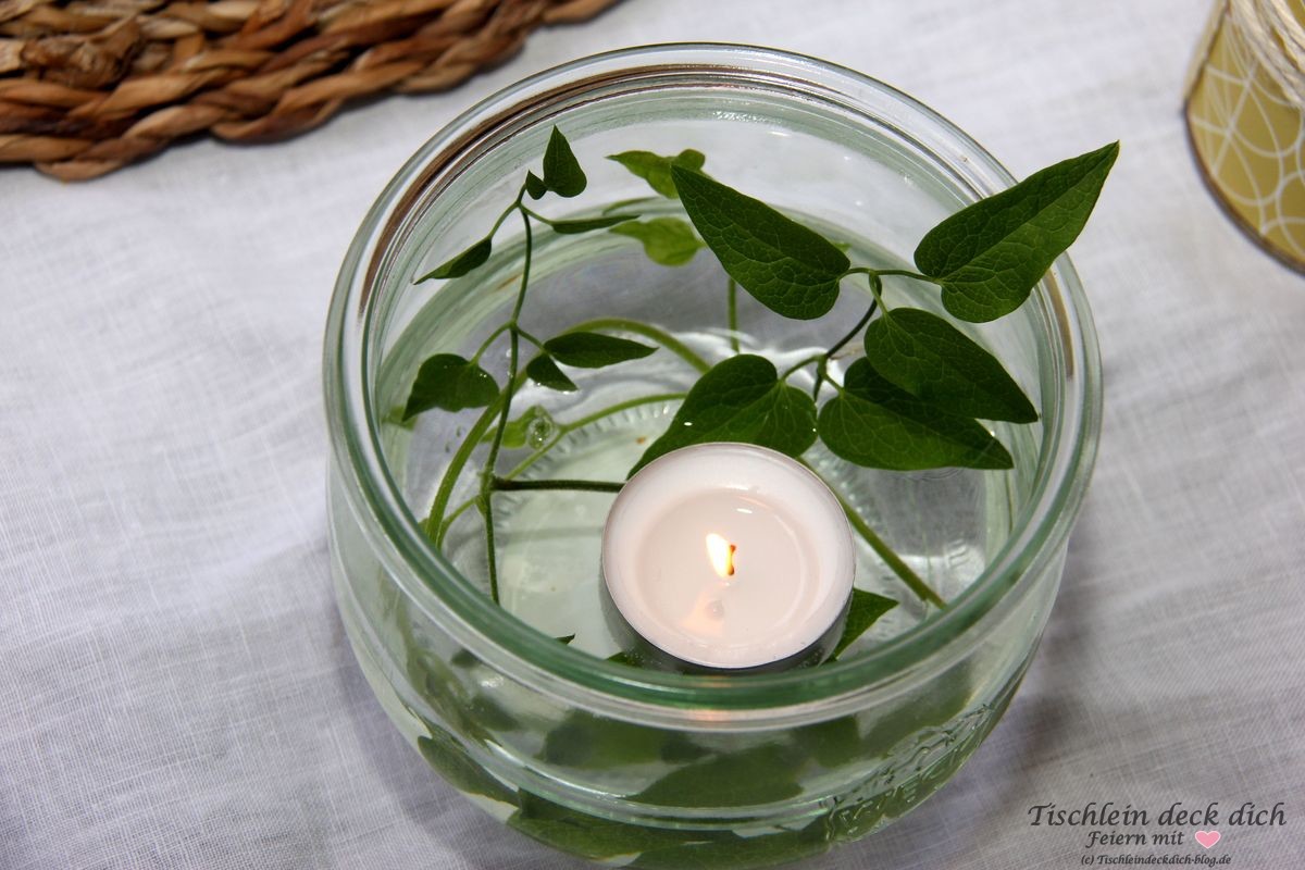 Ist Dir eigentlich auch schon mal aufgefallen, dass man im Handel schwer an kleine Schwimmkerzen kommt? Jedenfalls bei mir mal wieder Fehlanzeige. Also habe ich improvisiert und festgestellt, dass auch kleine Teelichter in Aluhüllen schwimmen. Das kleine Einweckglas brauchte für die Dekoration lediglich ein paar Ranken unserer Clematis. Andere hübsche Gräser eignen sich sicherlich genauso gut. Die Teelichte verlöschten allerdings, bevor der Wachs komplett verbraucht war. Das wird zum einen vielleicht am kühlen Wasser liegen. Und zum anderen, weil die Kerzlein ein wenig Schieflage hatten und der Wachs nicht gleichmäßig abbrennen konnten. Trotzdem – kann man gut machen.