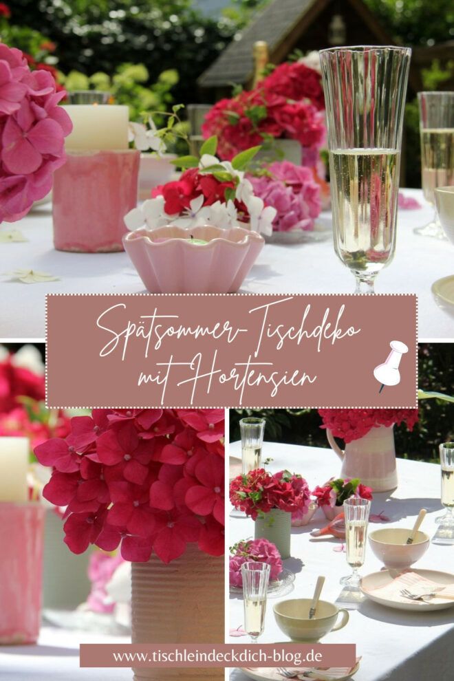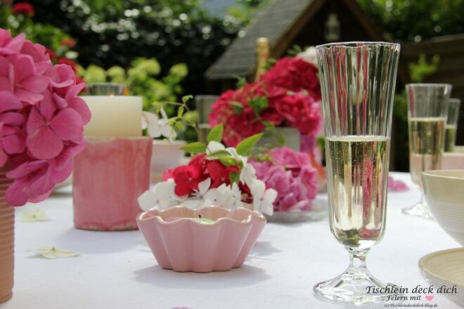 Die Tischdekoration lieferte mir der eigene Garten. Unsere Hortensien blühen in den unterschiedlichsten Farben. Nur blaue sind leider nicht mehr dabei. Vielleicht sollte ich sie im nächsten Jahr mal mit einem speziellen Blaudünger gießen?