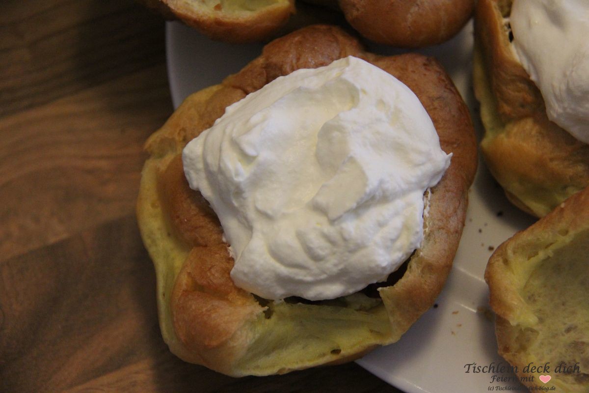 …z.B. zu leckeren Windbeuteln gefüllt mit Sahne, Kirschen und Mandarinen aus der Dose. Unbedingt solltest Du sie mit Puderzucker bestäuben. Auch eine Schokoglasur ist eine leckeres „Finish“ für das Gebäck.
