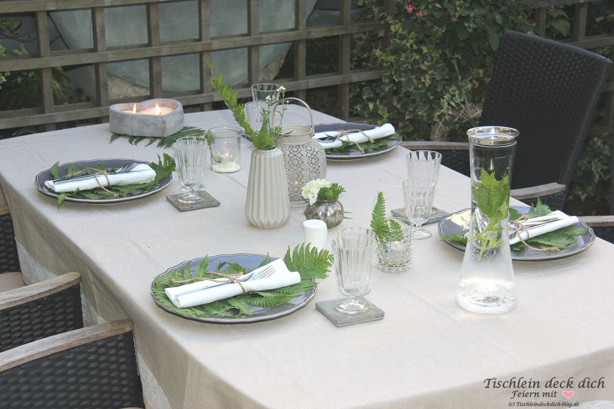 Weil es bei uns im Garten in manchen Ecken an Sonne fehlt, fühlt sich Farn hier pudelwohl. Für ein spontanes Abendessen mit der Familie, durfte er für eine trendige und schlichte Tischdekoration herhalten.