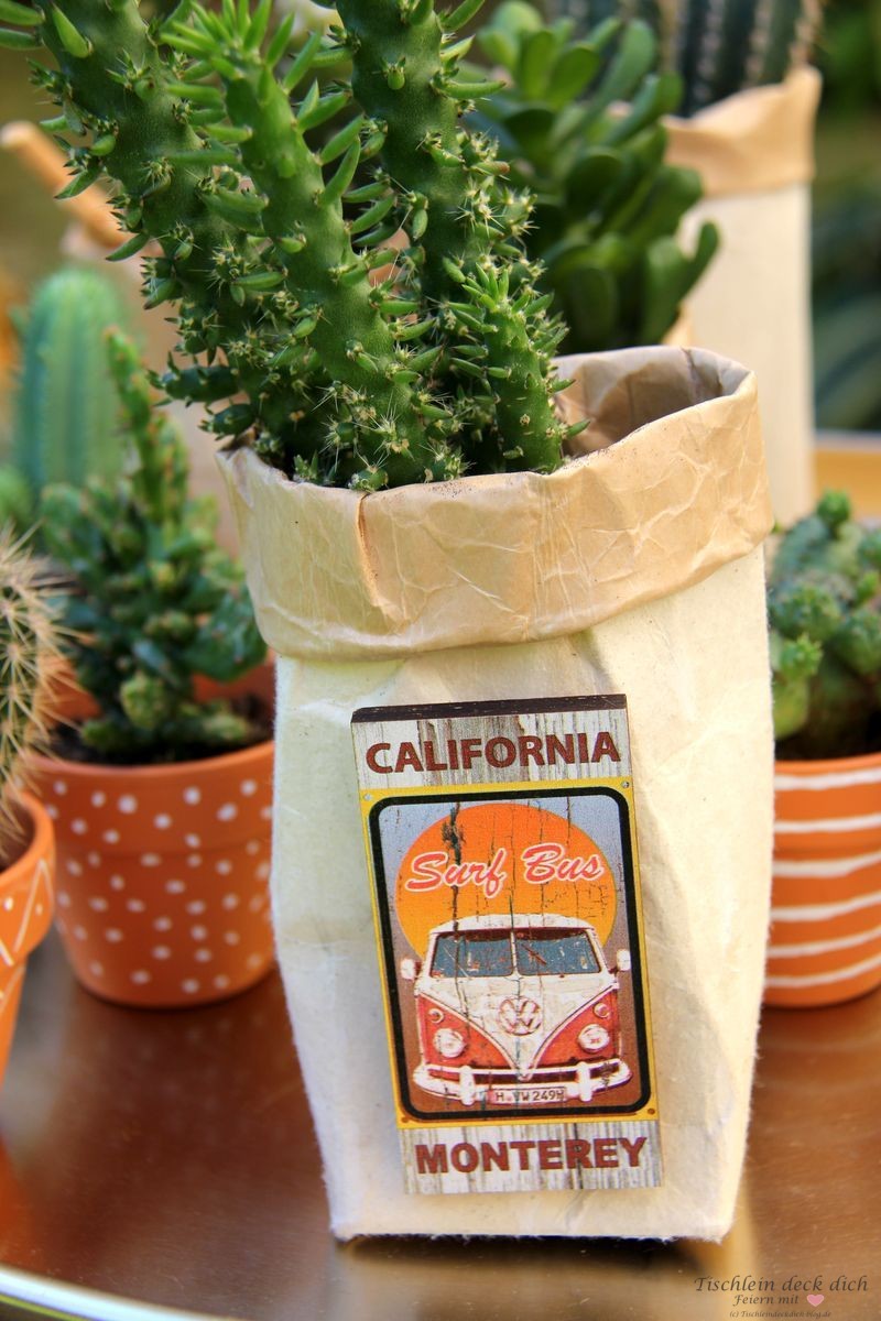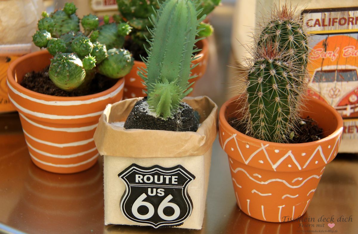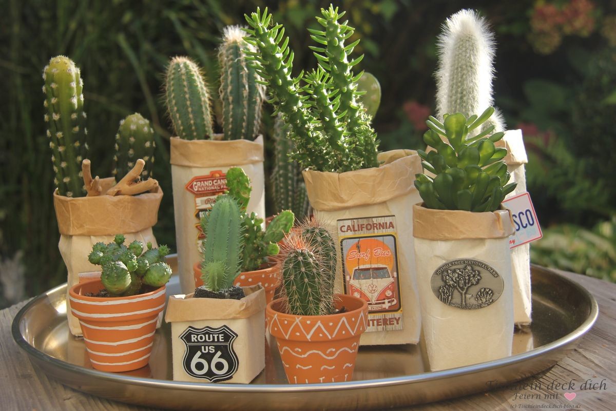 In unregelmäßigen Abständen treffen sich die ‚kochenden Freunde‘ um zu einem zuvor verabredeten Motto ein 3-Gänge Menü zu kochen. Aus aktuellem Anlass, nämlich unser Kalifornien Urlaub im September, lautete das Motto also: KALIFORNIEN. Die Gastgeber, diesmal Wolfgang und ich, sind für die Hauptspeise und die Tischdekoration verantwortlich. Ich denke mal, es ist klar, wie das bei uns aufgeteilt wird, oder? 😉 Das Herzstück meiner Tischdekoration waren die kleinen Kakteen. Für die Übertöpfe habe ich auf meine Upcycling Idee mit den Tetrapack Milchtüten zurück gegriffen.