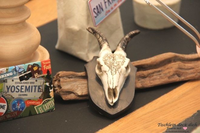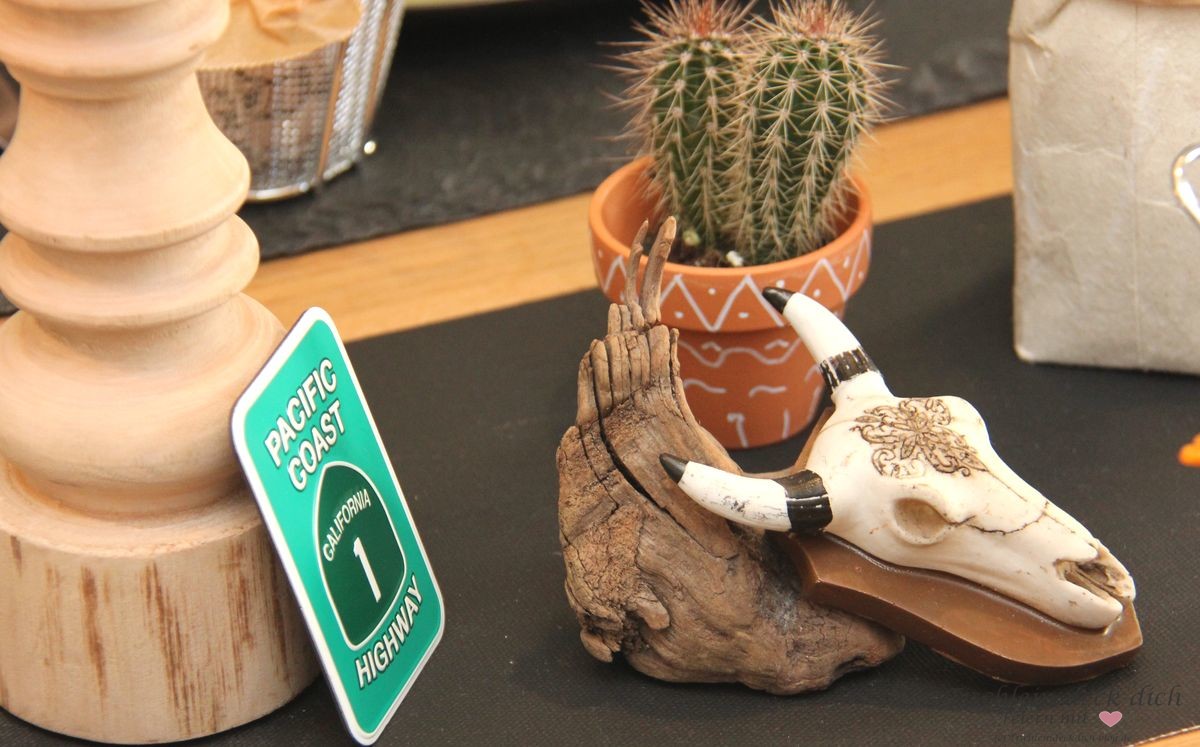 Die Schädel habe ich zufällig bei Action entdeckt. Zusammen mit dem alten Holz waren sie ein tolles Dekoelement in meiner Tischdekoration. Schließlich waren wir viel in der Wüste unterwegs und da findet man so etwas. Glaube ich ;-).