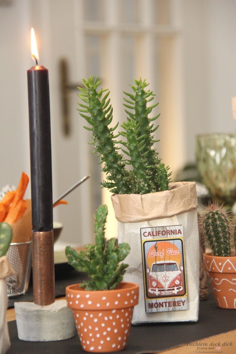 Wie ich Dir bereits erzählte, stecken die Kakteen in Milchtüten, die ich für die Deko bearbeitet habe, die perfekte Upcycling Idee. Weitere Mini-Kakteen habe ich in kleine Tontöpfchen gestellt, die ich zuvor mit weißem Edding verziert habe. Kringel, Zacken, Punkte – einfach mal drauf los gemalt. Die Kerzenleuchter aus Beton mit Kupferrohr habe ich schon vor einigen Monaten mal gebastelt, aber sie sind bislang noch nie zum Einsatz gekommen. Umso mehr habe ich mich gefreut, dass sie für diese Tischdekoration perfekt waren.