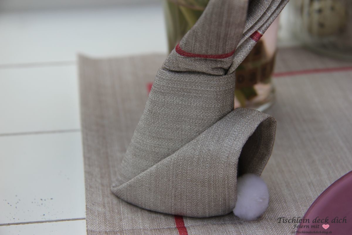 Die Serviette als Osterhase gefaltet eignet sich so wirklich nur zur Dekoration, denn nach dem Falten wollte der Mümmelmann am Bauch mit Kleber aus der Pistole fixiert werden. Und da ich diese schon mal angeheizt hatte, bekam Meisterlampe noch ein kleines Stummelschwänzchen verpasst.