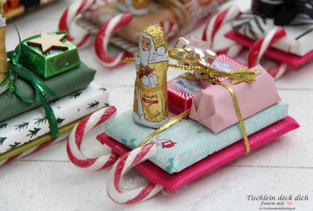 Der zweite, dritte, vierte… Schlitten ging dann ganz schnell. Keine 10 Minuten habe ich für ein Nikolausgeschenk gebraucht. Allerdings muss ich sagen, ich besitze eine Klebepistole, was das schnelle Basteln doch deutlich erleichtert. Flüssiger Kleber muss eben länger aushärten. Evt. eignet sich auch doppelseitiges Klebeband.