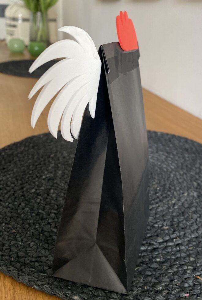 Hier erkennst du, wie ich es verklebt habe. Federn und Schnabel zwischen Vorder- und Rückseite der Tüte, den Kamm auf der Rückseite. (Verschlossen ist die Tüte mit schwarzem Washi Tape). Zum Verkleben von Moosgummi benötigst du einen speziellen Kleber, sonst hält es nicht. Tipp: Falls du Moosgummi nicht magst oder es nicht zu Hause hast, kannst du Tonkarton oder Wellpappe nehmen.