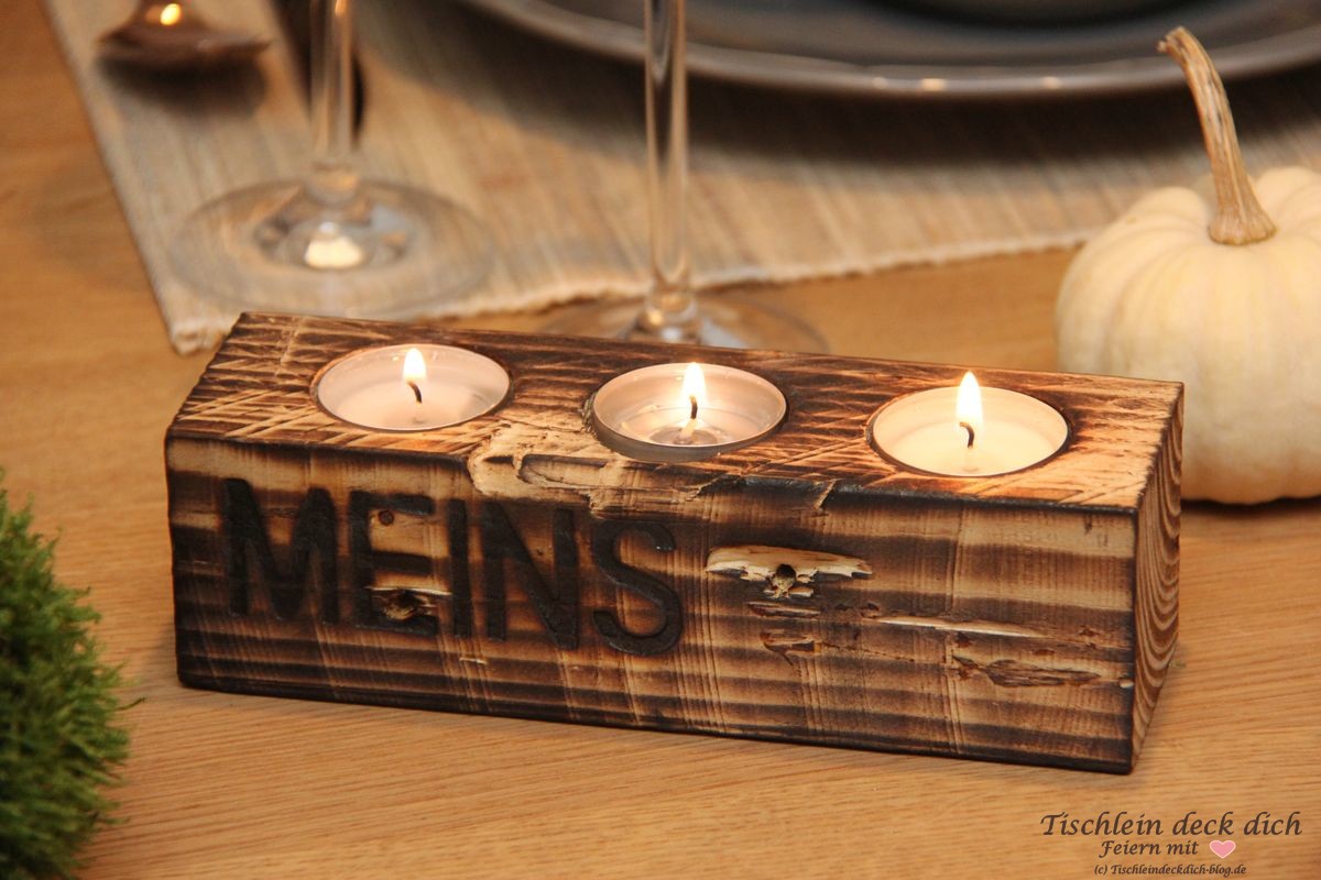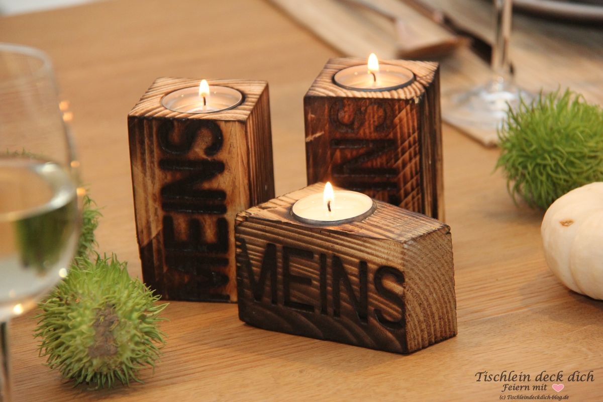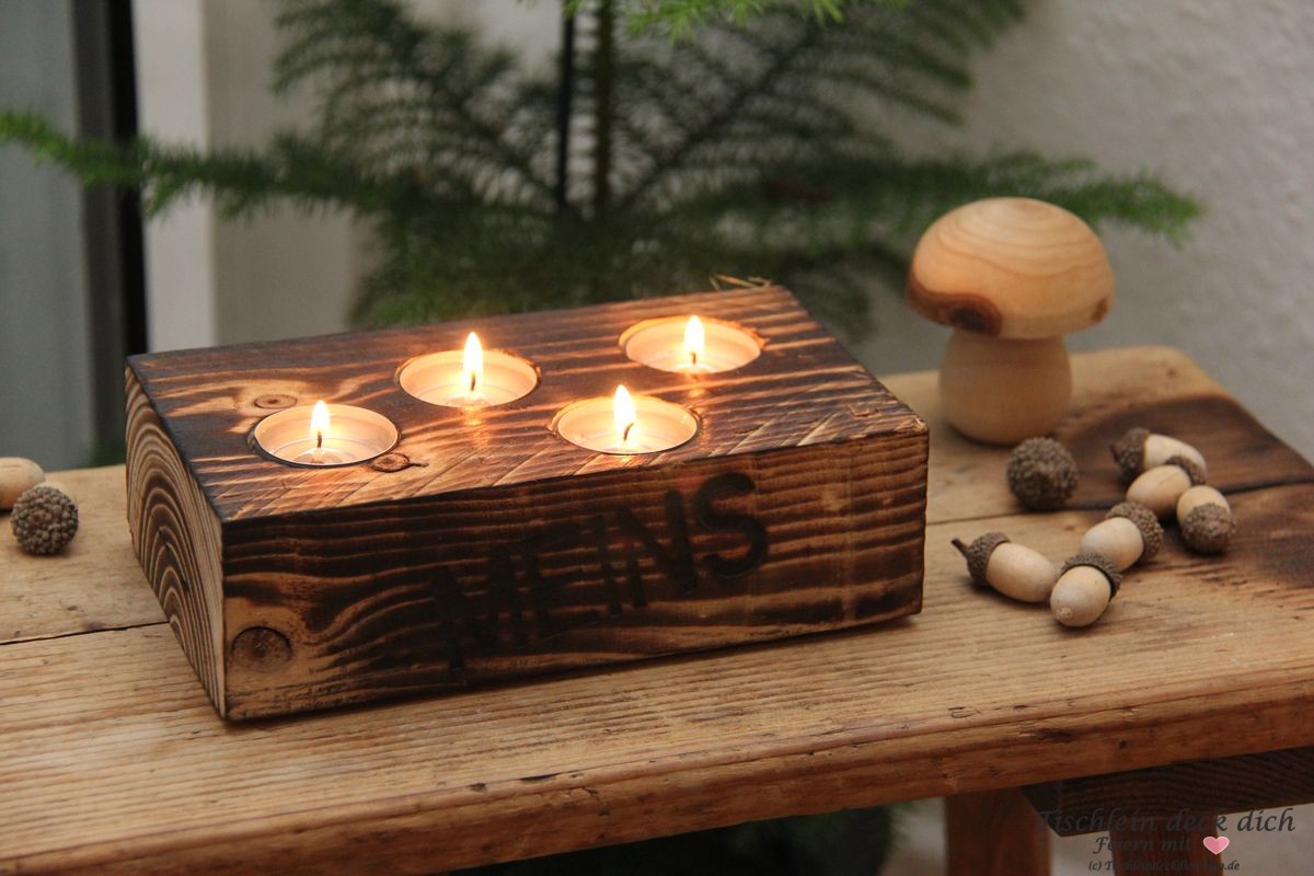 Holz in Kombination mit Kerzen wirkt doch immer besonders heimelig. Perfekt für den Herbst und Winter. Da für mich der Advent jedes Jahr ein bisschen überraschend kommt, würde ich den Adventsteelichthalter (was für ein geiles deutschen Kompositum!!) favorisieren. Letztes Jahr hatte ich noch Eichelkäppchen mit Goldfarbe angemalt, die würden super dazu passen (nur, hatte ich letztes Jahr eben keinen Adventskranz).