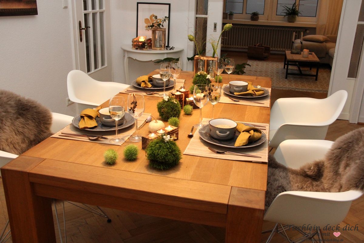 Die Teelichthalter der Meinsmanufaktur verteilte ich locker über den Tisch. Gut zum rustikalen Herbstambiente passten die stacheligen Dekogurken (so bezeichnet wurden sie auf dem Wochenmarkt angeboten), weiße Baby Boos und große Mooskugeln.
