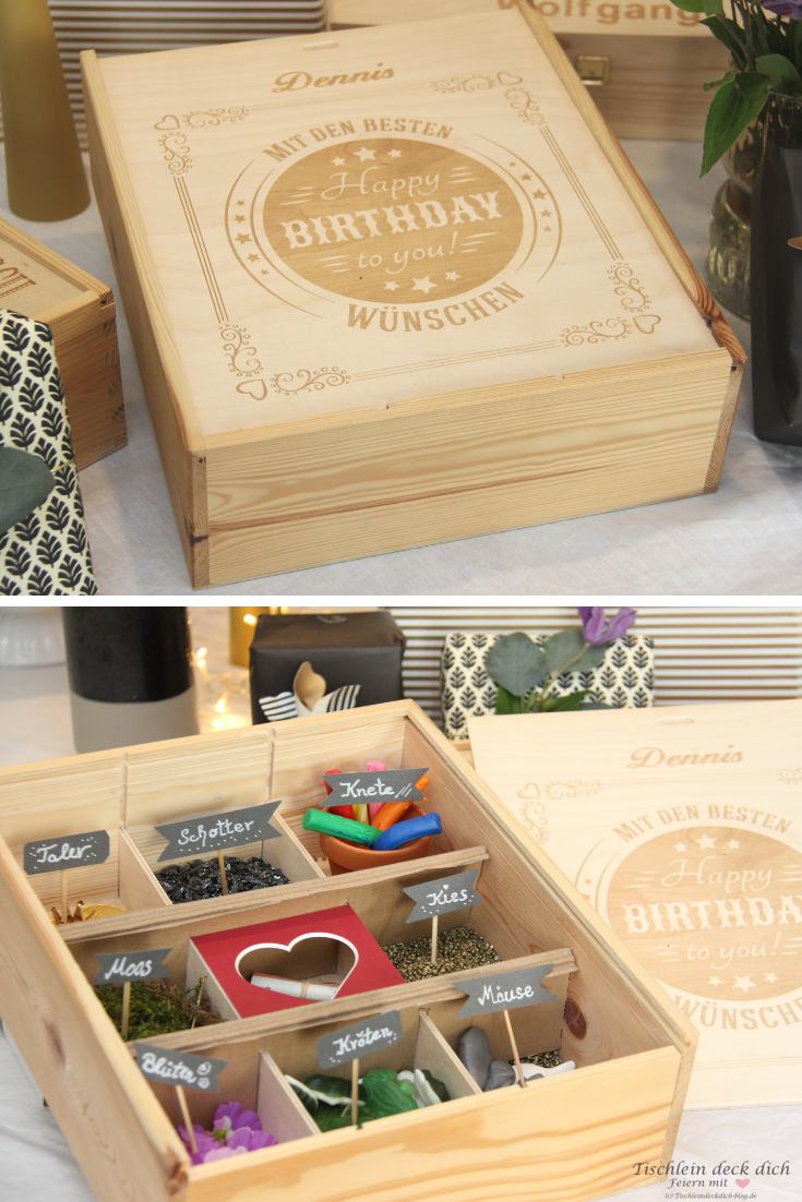 Die Holzboxen sehen toll aus, besonders die Idee den Namen des Geburtstagskindes auf den Deckel zu drucken (macht das Ganze so persönlich).