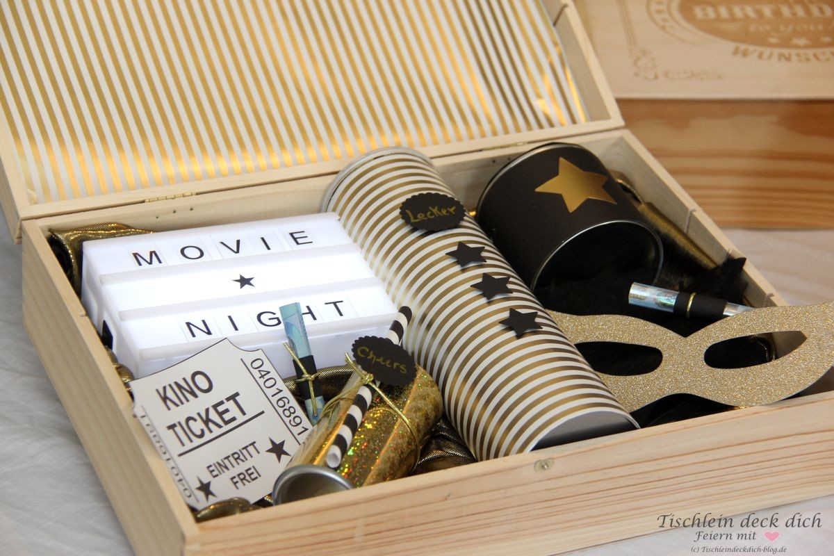 Auch hier wünschte sich das Geburtstagskind von seinen Gästen Geld zum Geburtstag, um sich davon einen lang ersehnten Wunsch zu erfüllen. Damit das Geldgeschenk eine ganz persönliche Note bekommt, laden wir den bekennenden Kinofan zusätzlich zur Movie Night ein, Chips und Getränke inclusive. Damit die Holzbox beim Öffnen richtig was her macht, habe ich sie mit Goldstoff ausgekleidet. Richtig glamourös sieht es aus, weil ich sowohl die Chipsdose, als auch die Nüssedose und die Getränkedose in ein gold/schwarzes Gewand gesteckt habe. Die Innenseite des Klappdeckels habe ich ebenfalls mit Geschenkpapier verkleidet. Nun fehlen noch die Geldscheinröllchen und das „Kinoticket“. Die Mini-Lightbox kannst Du kurz vor der Übergabe auf ‚on‘ switchen, jetzt leuchtet sie feierlich.