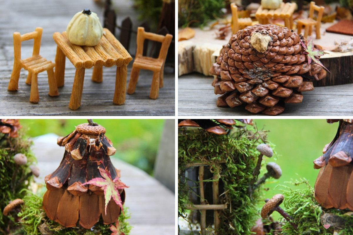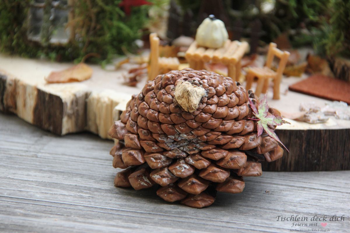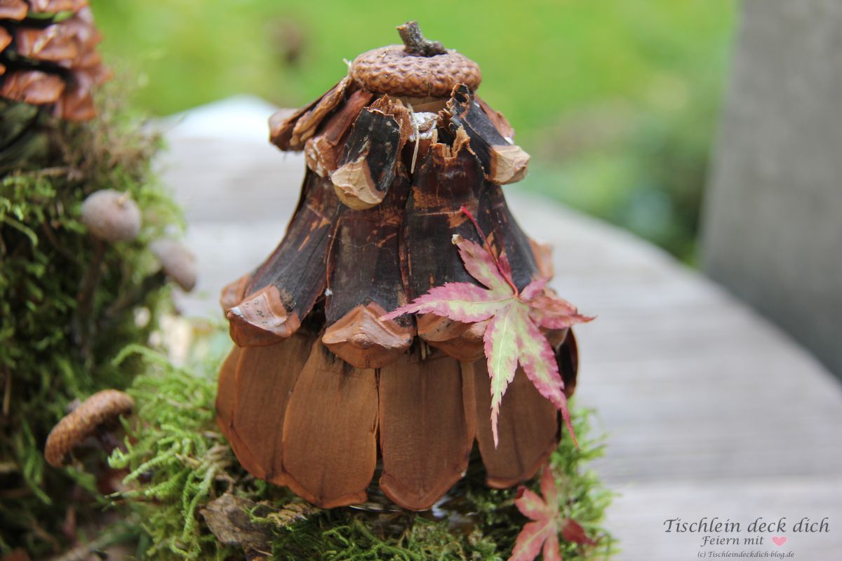 Aus einem großen Pinienzapfen wird im Handumdrehen ein Dach für das Wichtelhaus
