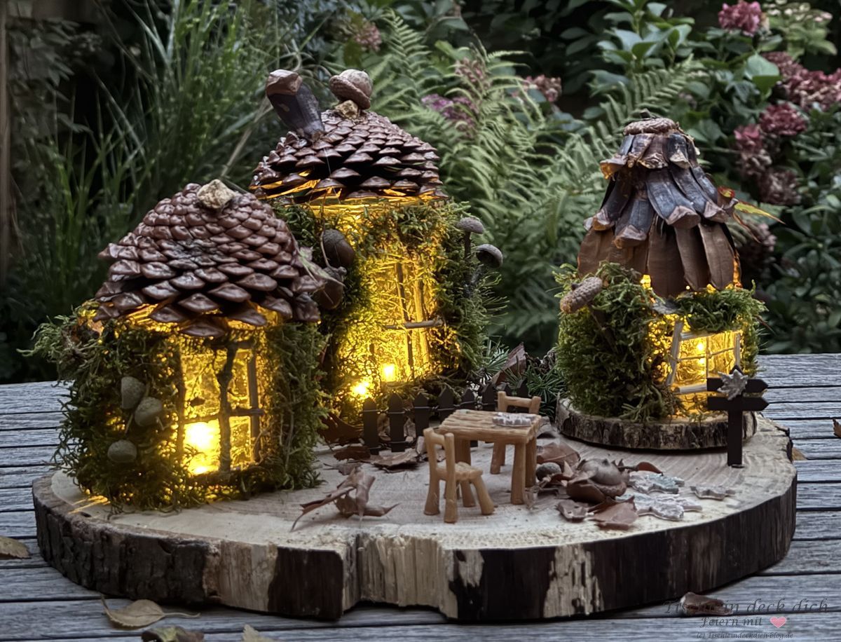 Abends leuchten die Wichtelhäuser wunderschön und verbreiten herbstliche Gemütlichkeit. Damit sie nicht unseren Eichhörnchen im Garten zum Opfer fallen, habe ich sie inzwischen im Wohnzimmer auf unserem Lowboard dekoriert.