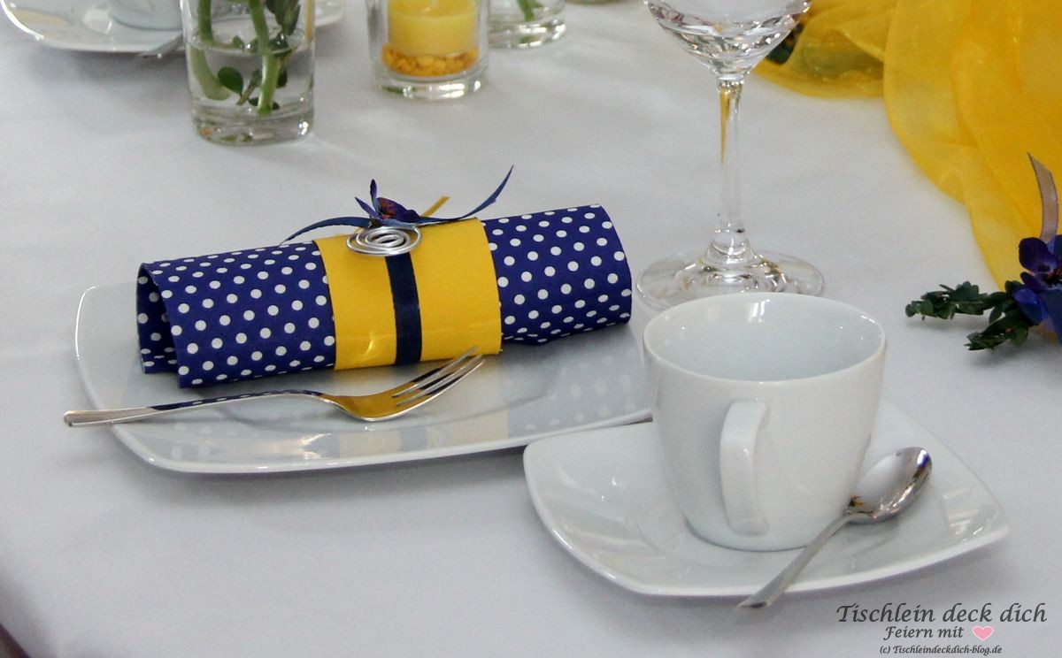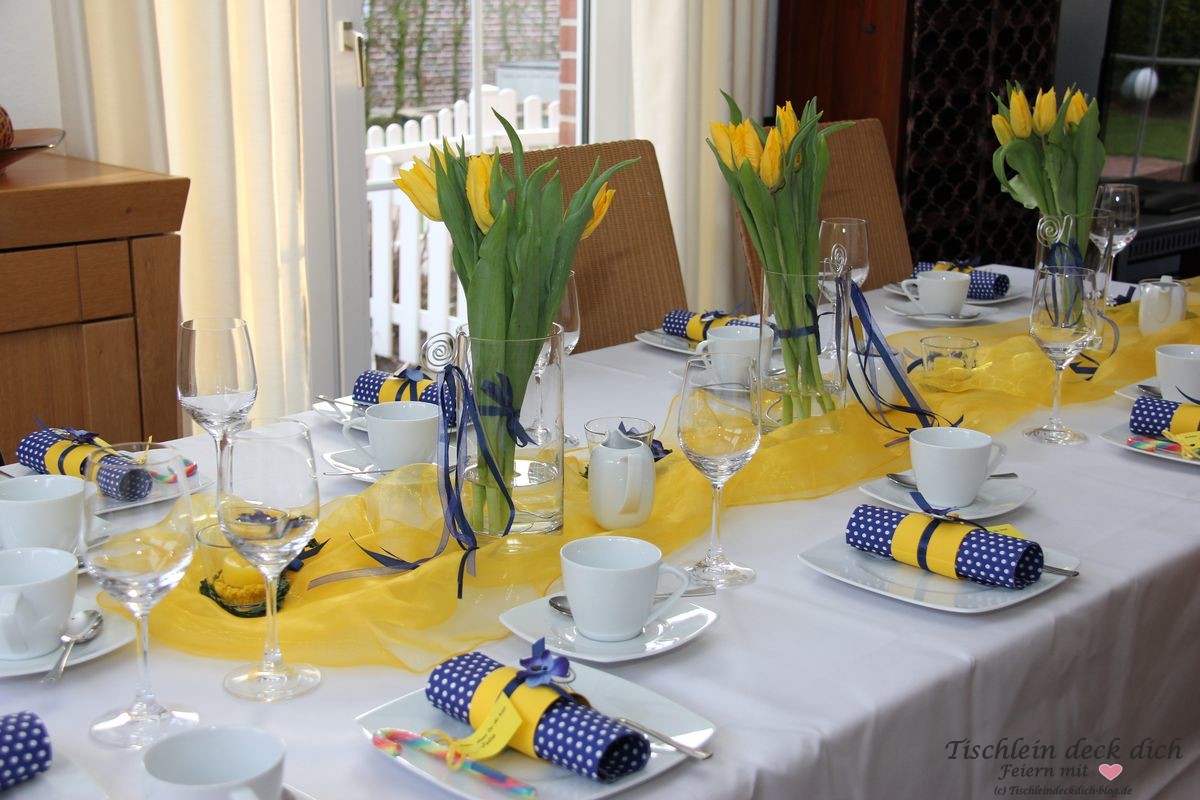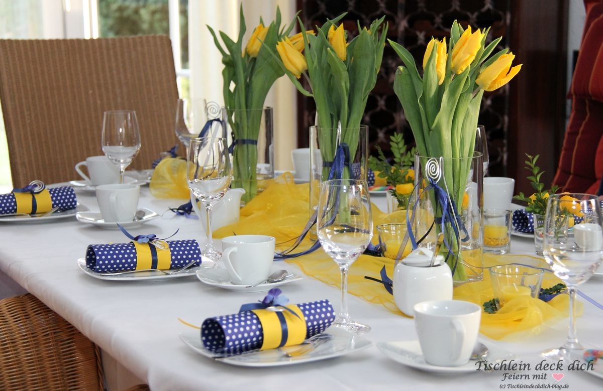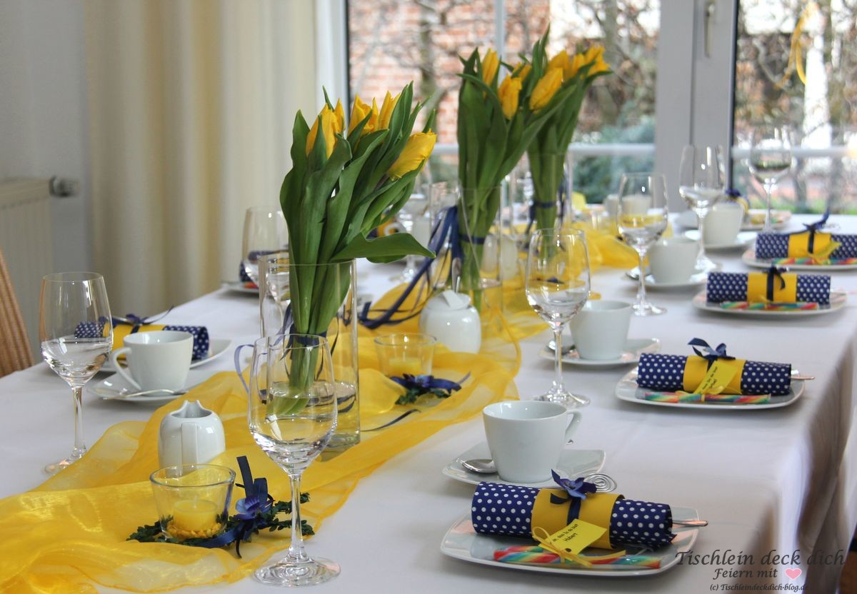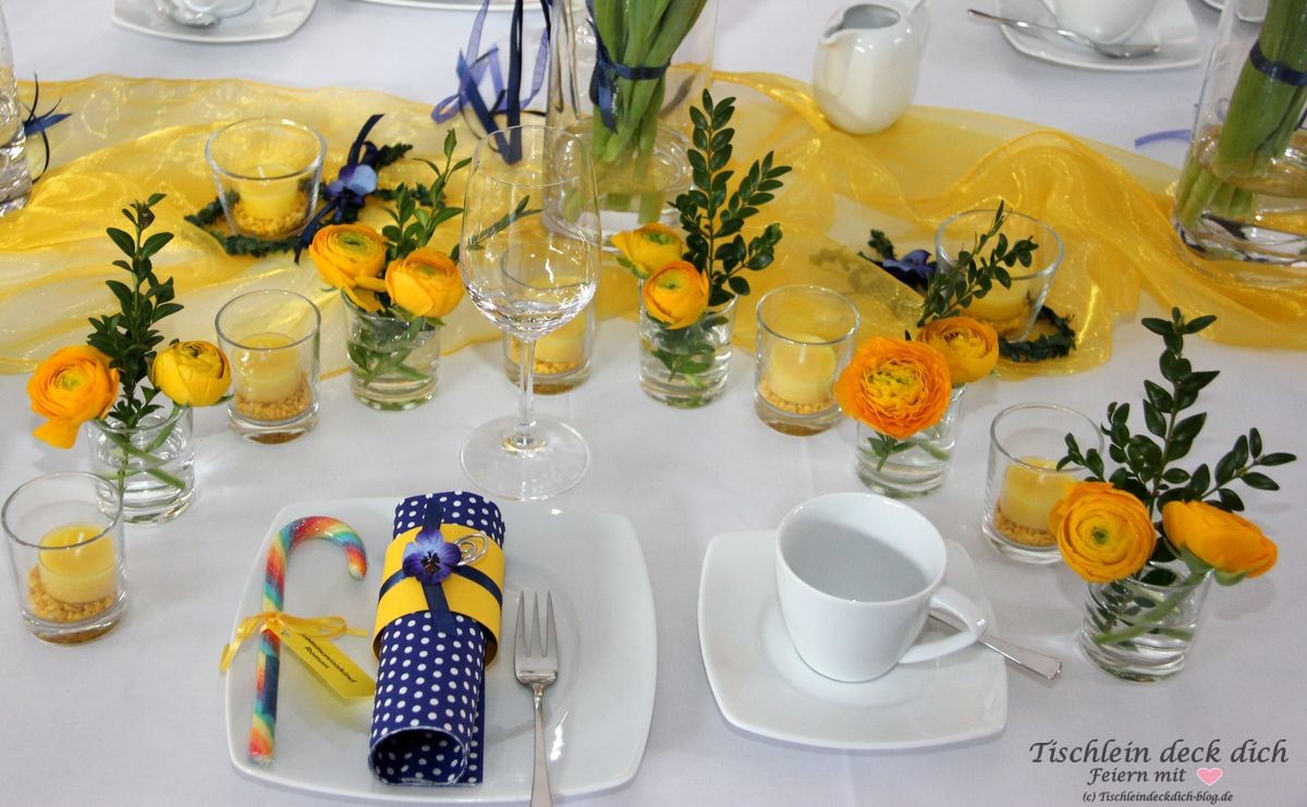 Tischdekoration für die Kommunion in frischem gelb und blau