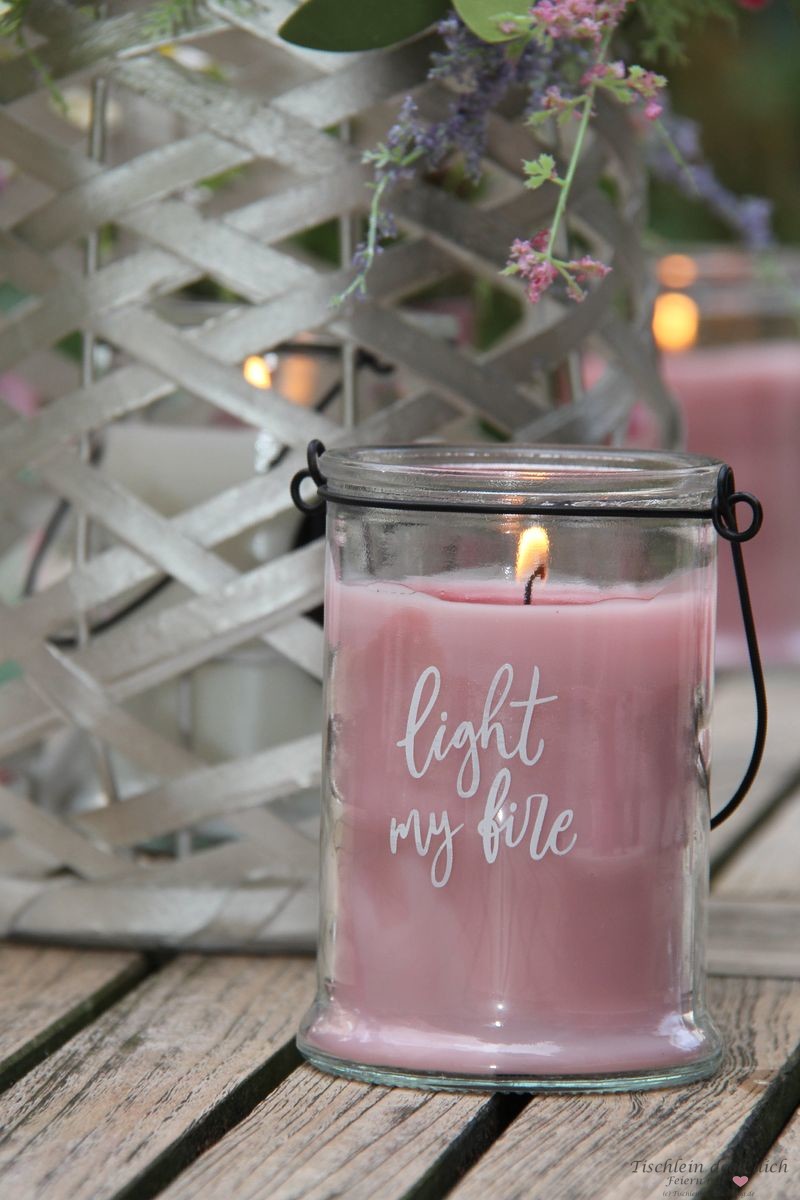 …um so schöner die Beleuchtung. Mit der beginnenden Dämmerung, hier bei uns wird ja dann doch irgendwann dunkel ;-), kam die Kerzendekoration richtig schön zur Geltung. Ich habe hier auf farblich passende Outdoorkerzen gesetzt. Die gehen nicht bei jedem kleinen Windhauch sofort aus.