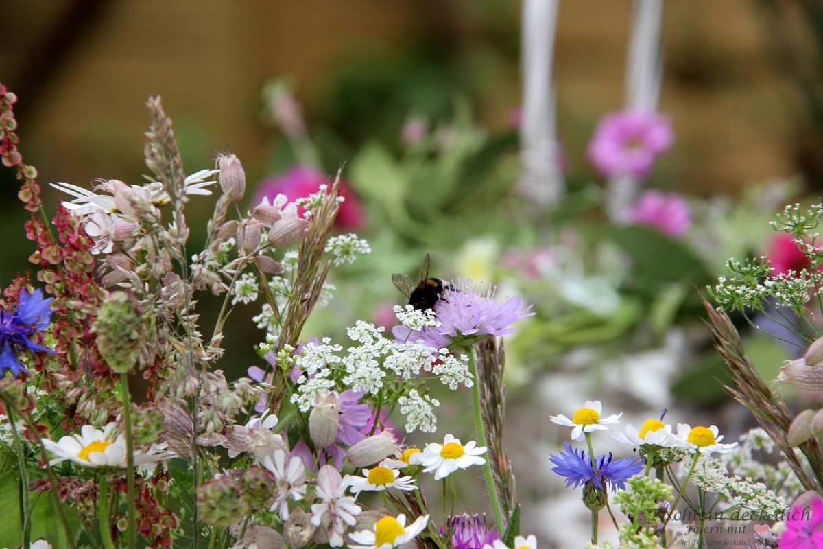Meine vielen Wiesenblumen hatte ich allesamt mit der Schere „geerntet“. Abschneiden fördert den Nachwuchs – habe ich mal gelesen. Und der Hummel war es egal, ob auf der Wiese oder in meiner Tischdeko. Von meinen Blümchen fühlte sie sich gleich angezogen und blieb den ganzen Nachmittag zu meiner Gesellschaft.