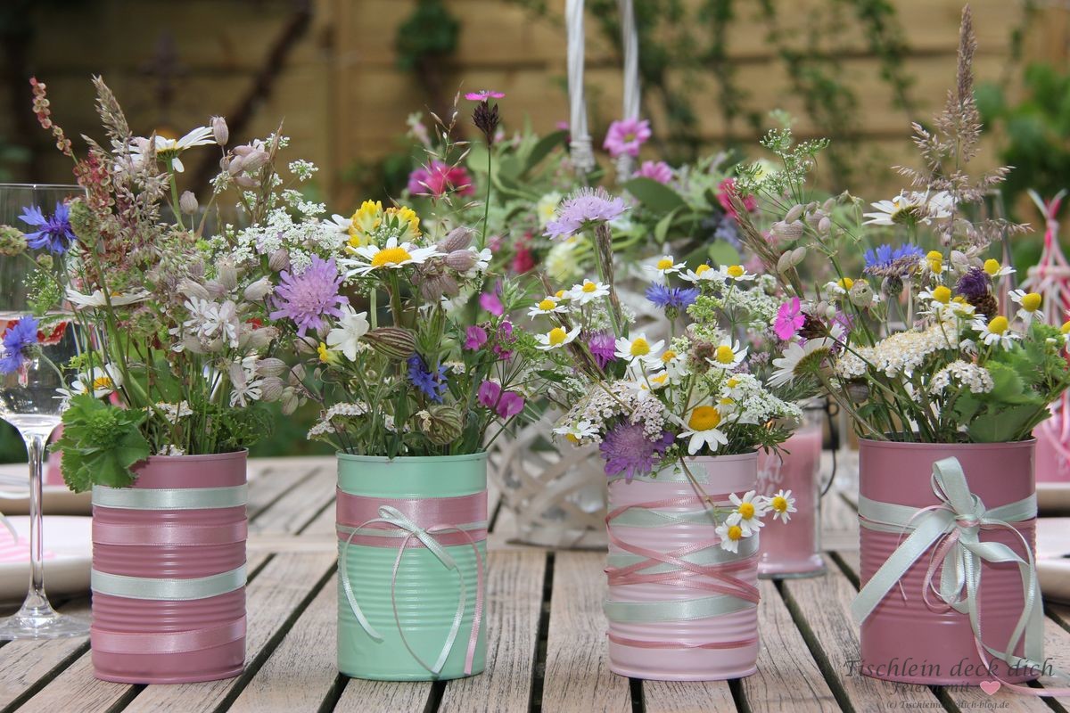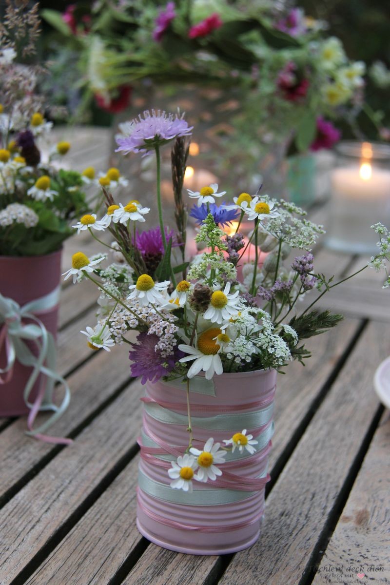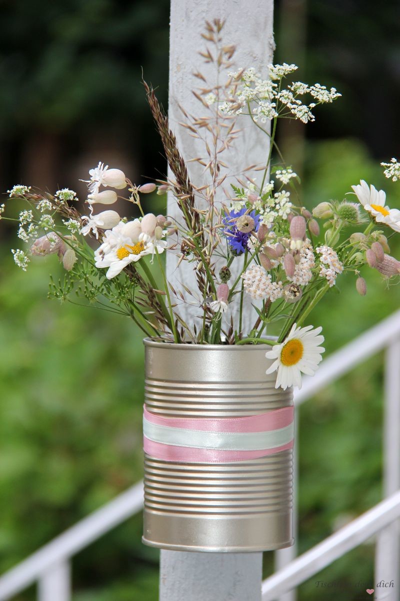 Mein Tipp: Baumstämme, Holzpfosten oder Geländer lassen sich mit den lackierten Konservendosen verschönern. Gemeinsam mit den Wiesenblumen und den bunten Bändern sorgen die Dosen für festliches Ambiente im ganzen Garten.